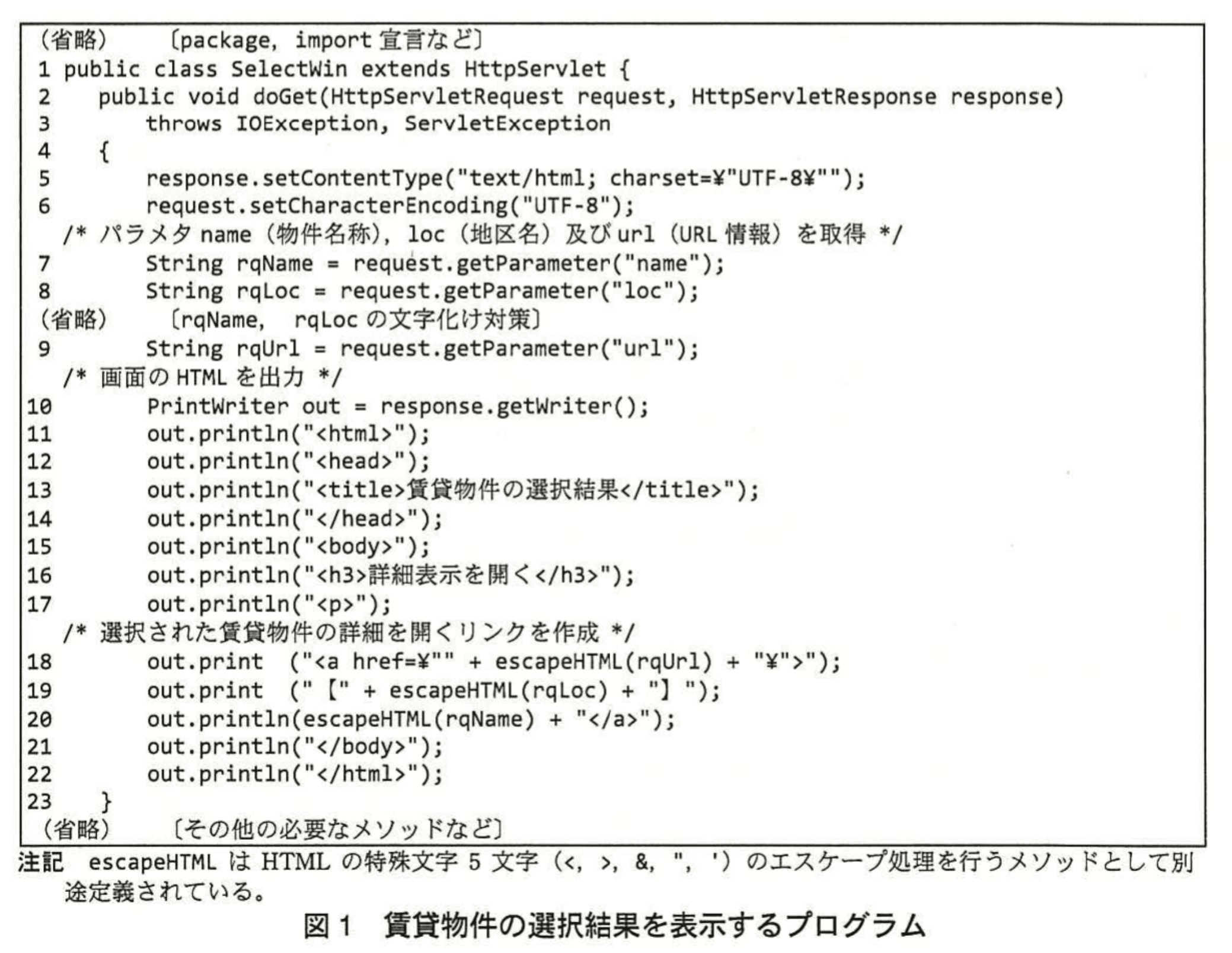 - 図1のb行目では、out.print ("<a href=""+ escapeHTML(rqUrl) + "">"); と、利用者入力の rqUrl を href 属性にそのまま出力しています。