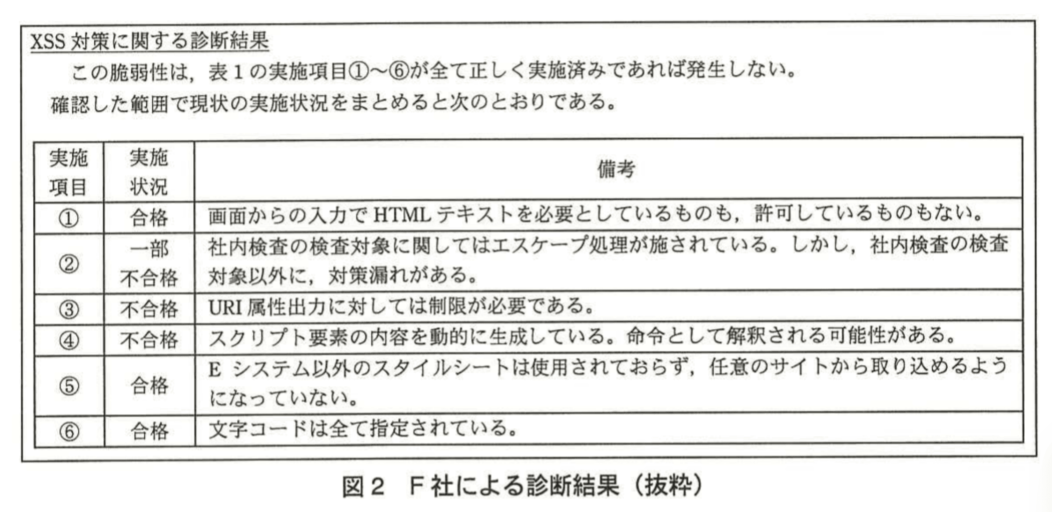 表2の判定基準に基づいた社内検査で脆弱性が検出されたことから、C部長は詳細な診断を受ける必要があると判断し、セキュリティ専門会社のF社に詳細な診断を依頼した。F社では、インターネット経由でのアクセスによるEシステムの診断とサーバプログラムのソースコードレビューを行った。F社による診断結果を、図2に示す。