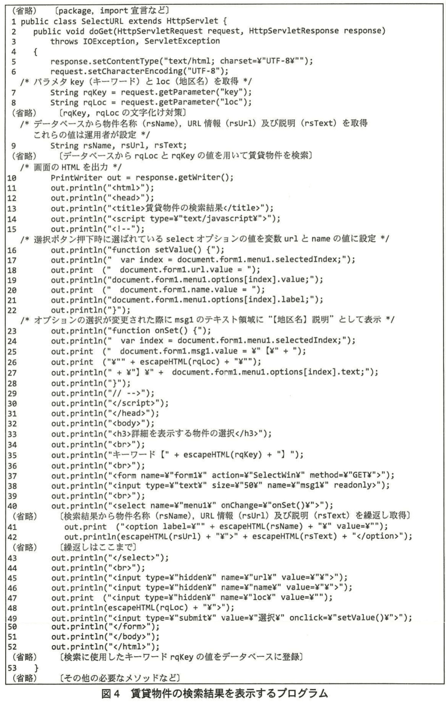 - 【図4】の 22〜27 行は、フォームの hidden フィールドへ値を設定する JavaScript をサーブレット内で生成しています。