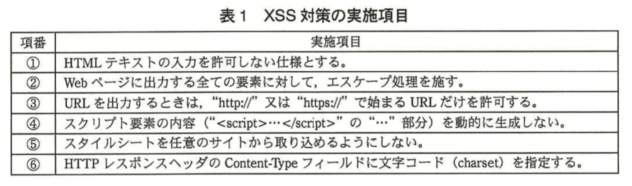 - 表1でスクリプト要素に関する対策を示しているのは「④ スクリプト要素の内容(“<script>…</script>” の “…” 部分)を動的に生成しない。」です。