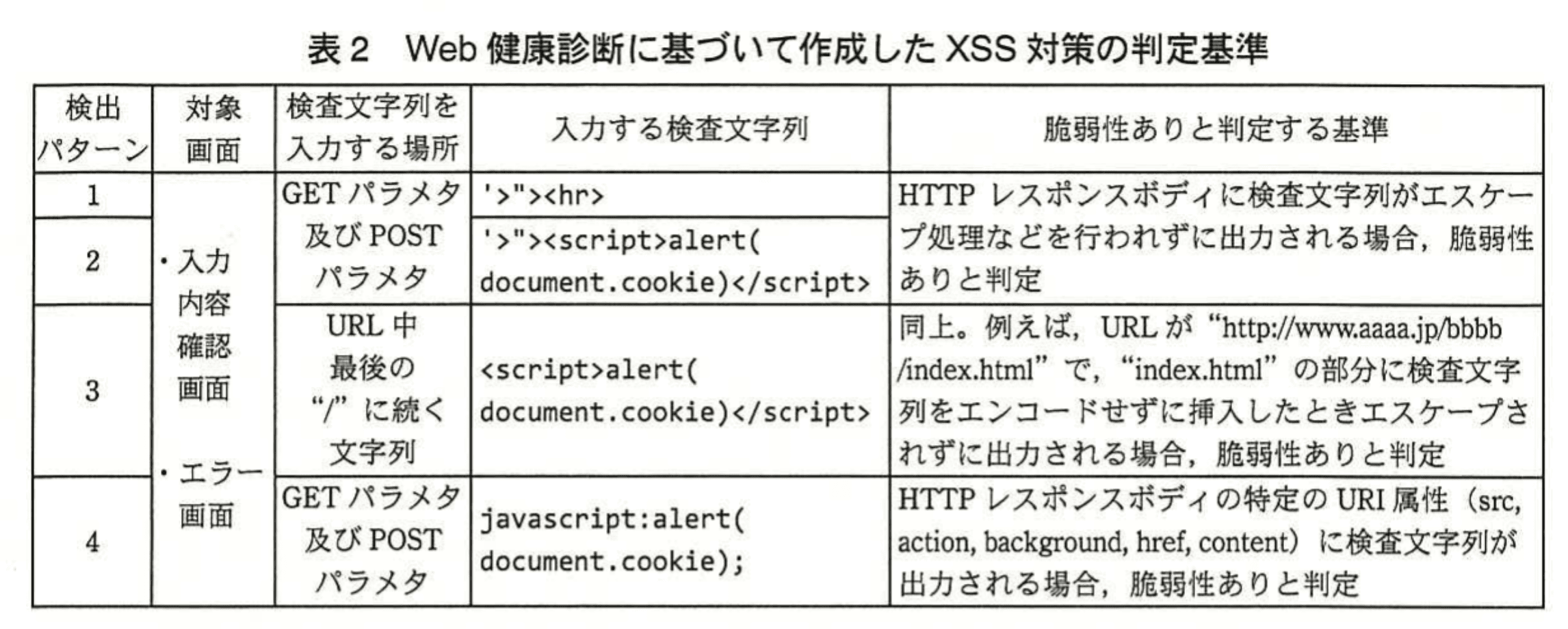 検出パターン4は、検査文字列に javascript:alert(document.cookie); を用い、「HTTPレスポンスボディの特定のURI属性(src, action, background, href, content)に検査文字列が出力される場合、脆弱性ありと判定」とされています。URI属性に javascript: スキームがそのまま出力されるのは、表1 の実施項目③「URLを出力するときは、"http://" 又は "https://" で始まるURLだけを許可する。」を満たしていないために起こります。