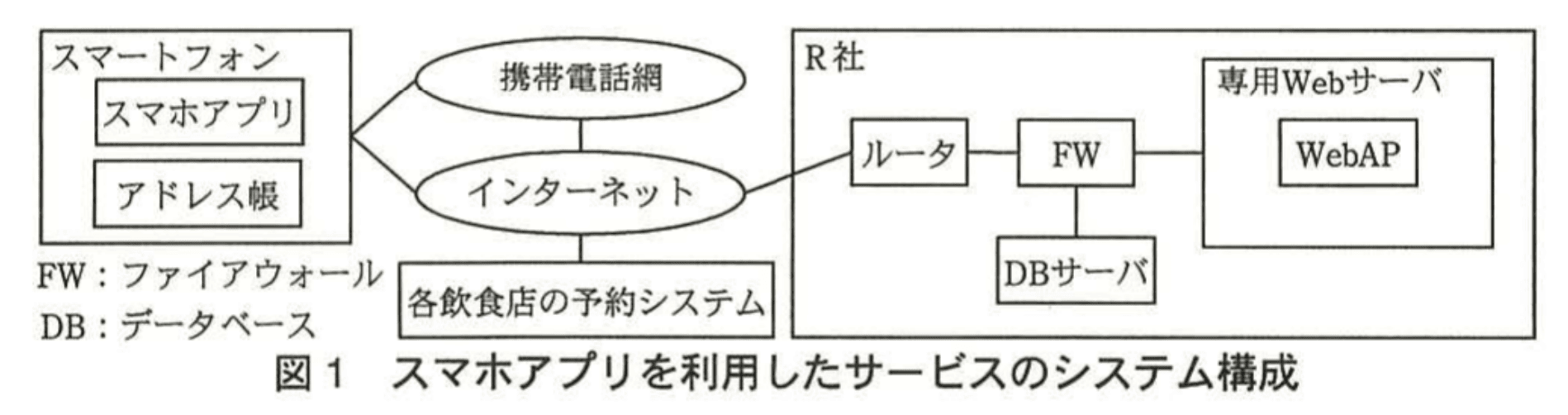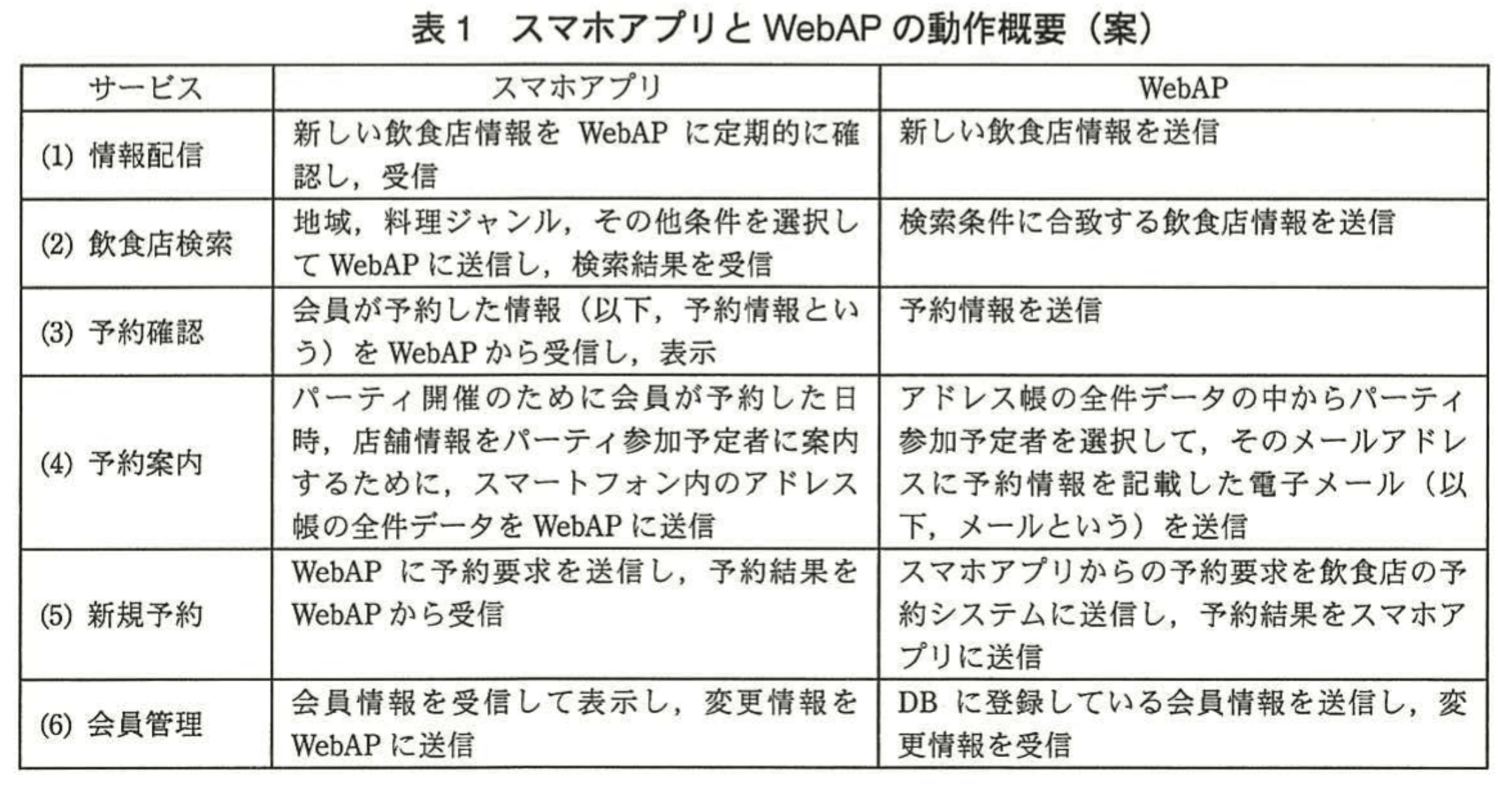 スマホアプリは、専用Webサーバに設置するWebアプリケーション(以下、WebAPという)と通する。WebAPは各食店の予約システムと通信して、予約を行う。スマホアプリを利用したサービスのシステム構成を図1に、スマホアプリとWebAPの動作概要(案)を表1に示す。
