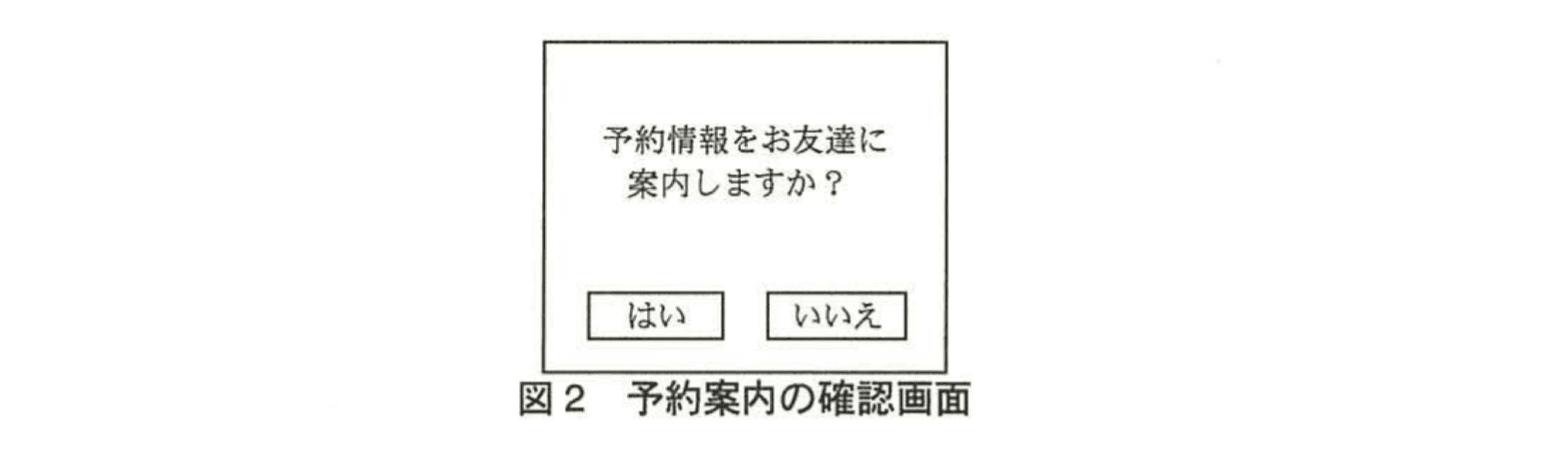 (1) 利用者が、スマホアプリの画面で“友達に案内する”ボタンを選択すると、図2のような予約案内の確認画面が表示される。