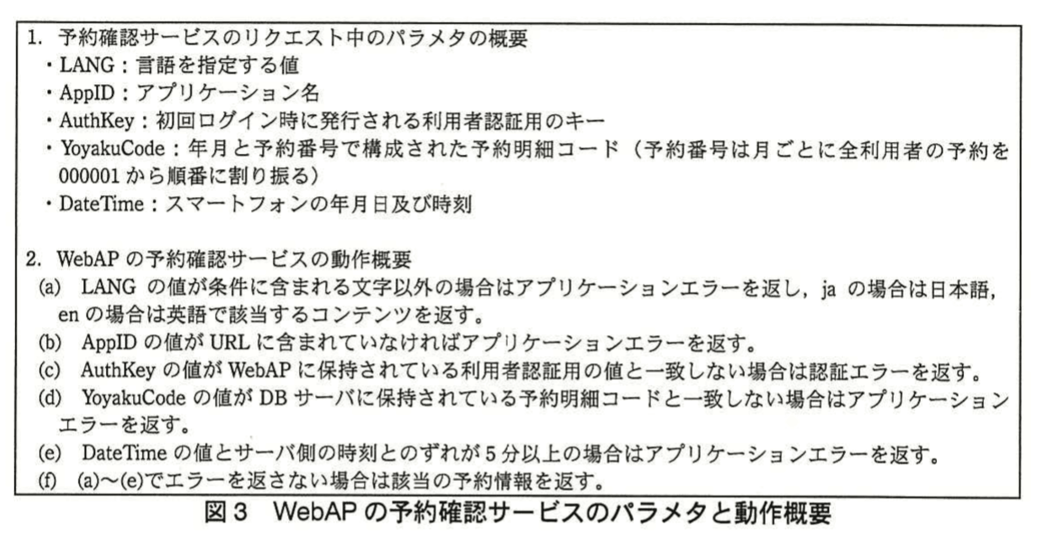開発後、スマホアプリとWebAPに関して第三者のセキュリティ評価を受けることが決定された。そこでBさんは、この分野で実績があるS社を選んでセキュリティ評価を受けることにした。S社によるセキュリティ評価の結果、WebAPの予約確認サービスには他人の予約情報を取得できてしまうという問題があるとの指摘を受けた。予約確認サービスのリクエストに含まれるパラメタの概要と、WebAPの予約確認サービスの動作概要を図3に示す。