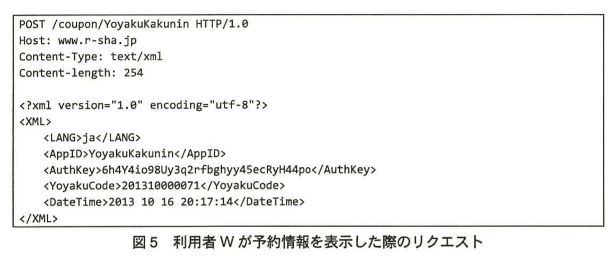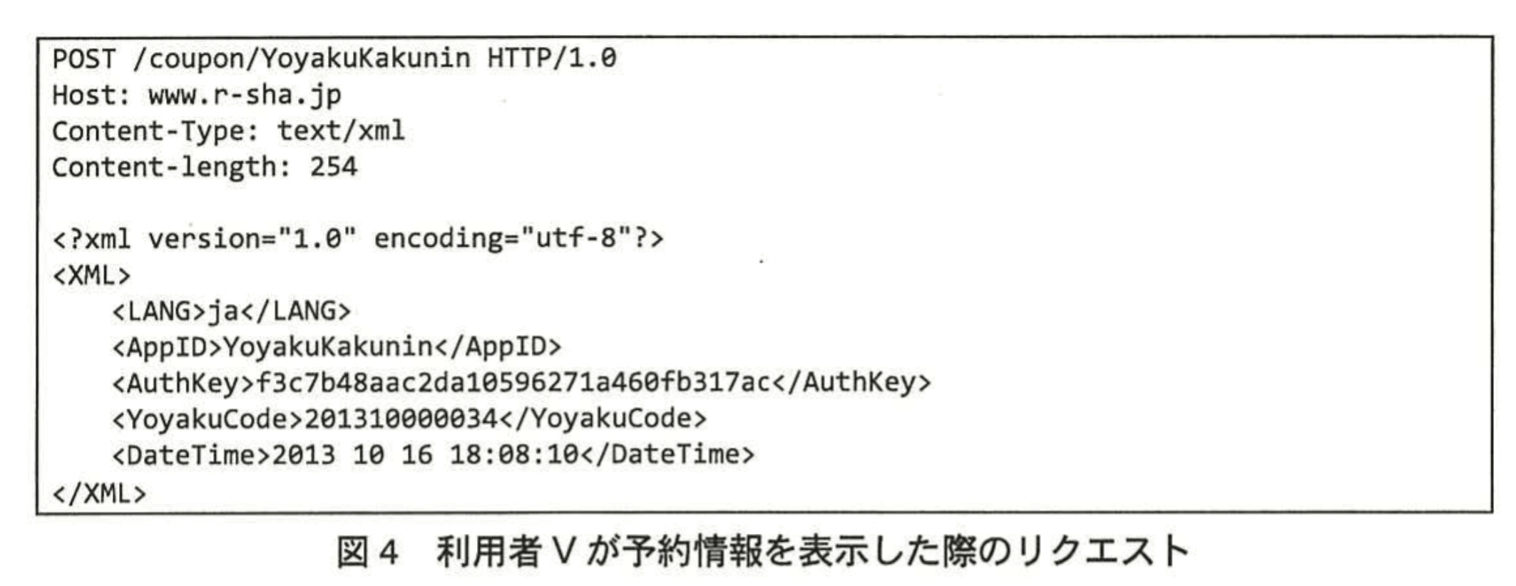 となっており、YoyakuCode と DateTime を適切に改ざんすれば他人の予約情報を取得できる事実が示されています。 - したがって利用者Vは、図4のリクエスト中の