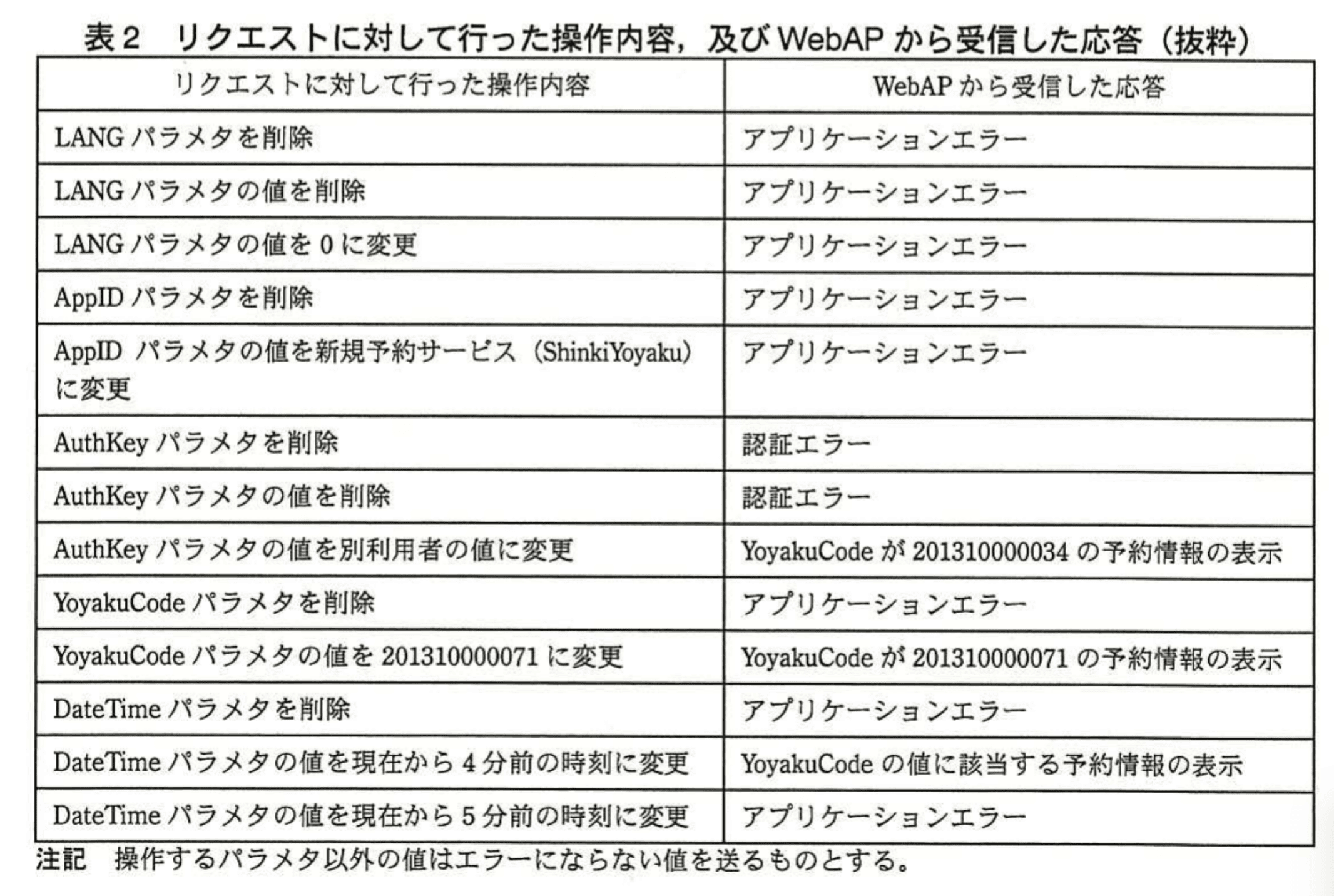 この問題は、ある利用者(以下、利用者Vという)が、数日前に自分が発した予約確認のリクエスト中に含まれるパラメタのうちの二つのパラメタの値を変更して送信することによって、別の利用者(以下、利用者Wという)の予約情報を取得することができるというものであった。つまり、④利用者Vが予約情報を表示した際のリクエストである図4で使われるパラメタのうちの二つの値を変更して送すると、利用者Wが予約情報を表示した際のリクエストである図5に対する応答を得られるというものである。セキュリティ評価では、仕様書などを参考にして、図4のリクエストに操作を加えた上で、WebAPに送言し、その応答を確認した。予約確認サービスについて、図4のリクエストに対して行った操作内容、及びリクエストに対してWebAPから受した応答を表2に示す。
