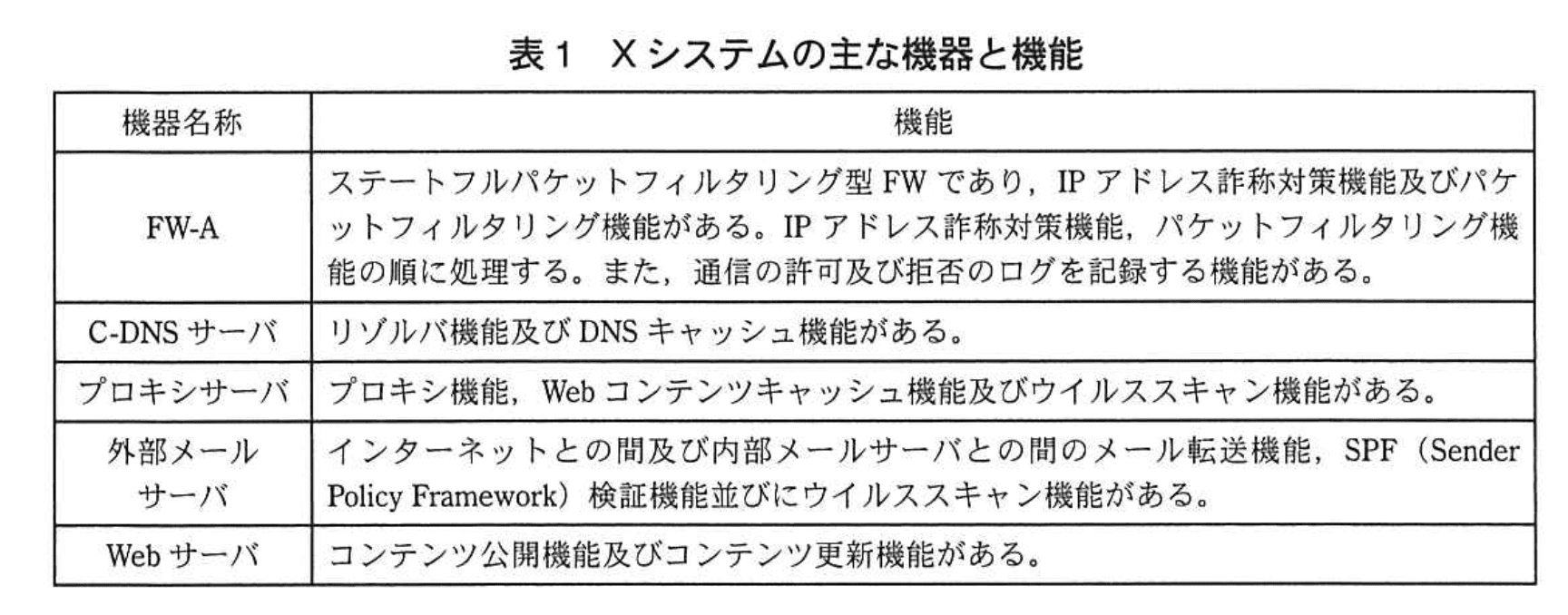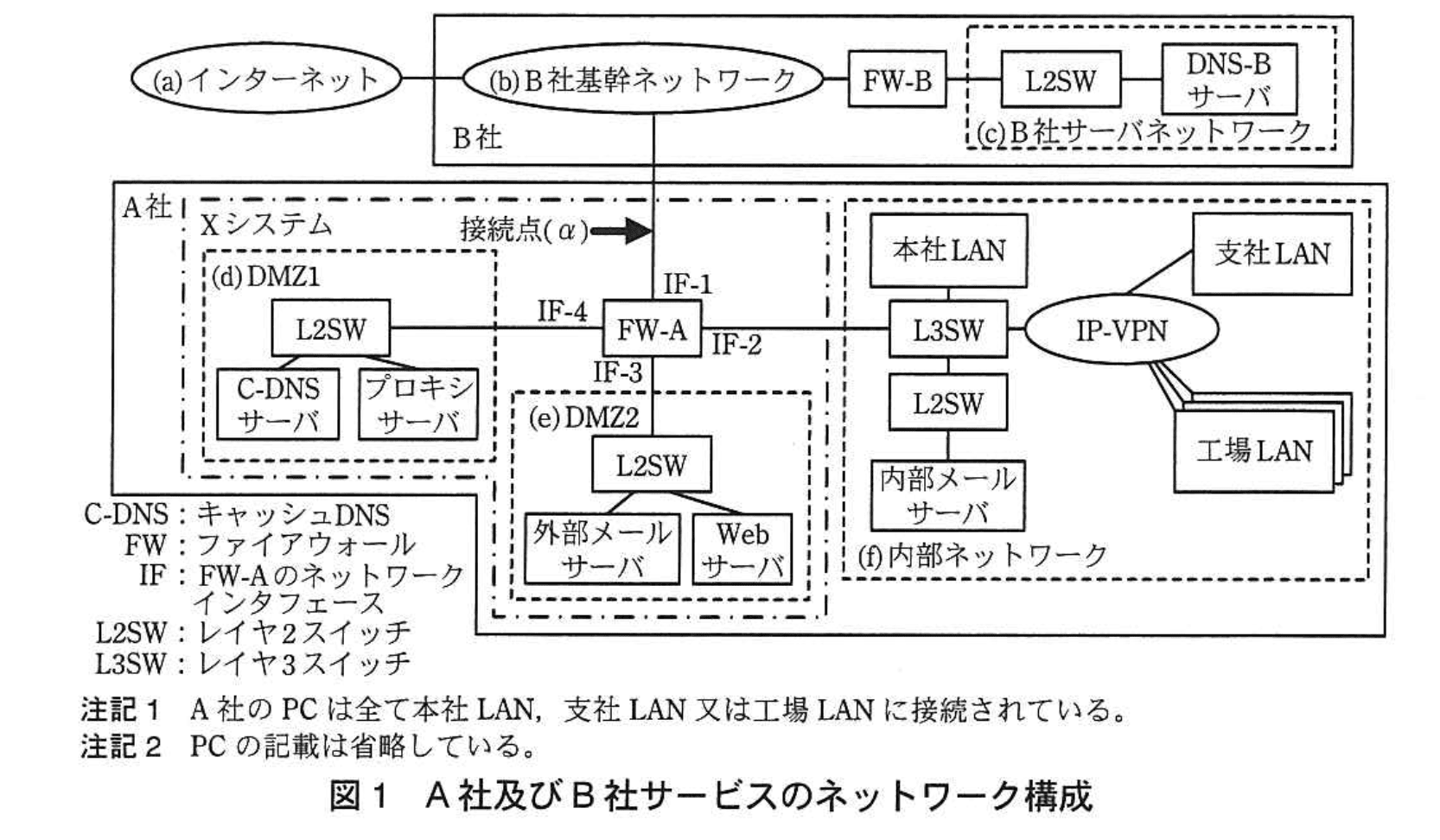 - 支社プロキシサーバの名前解決は当初、既存の「C-DNSサーバ」に委ね、通信は「B社サービス」経由で行う計画でした。本文には「送信元が支社プロキシサーバに詐称された問合せPT を拒否する設定は不可能であり、FW-A のIP アドレス詐称対策機能が有効に機能しない」とあります。