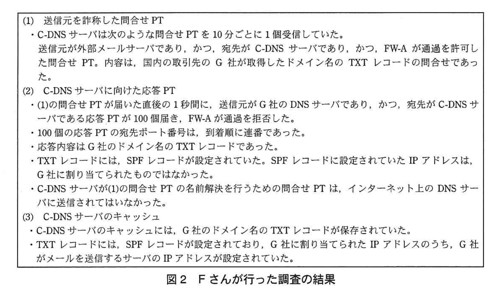 この結果から、E主任は、図2の(2)はG社のドメイン名のTXTレコードに対するCP攻撃であると判断した。