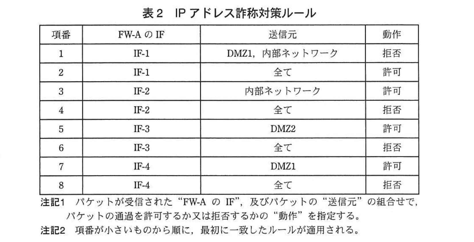 - FW-A の IP アドレス詐称対策は「受信インタフェースと送信元アドレス帯の組合せ」で不正を判定する仕組みである(表2のルール構造)。