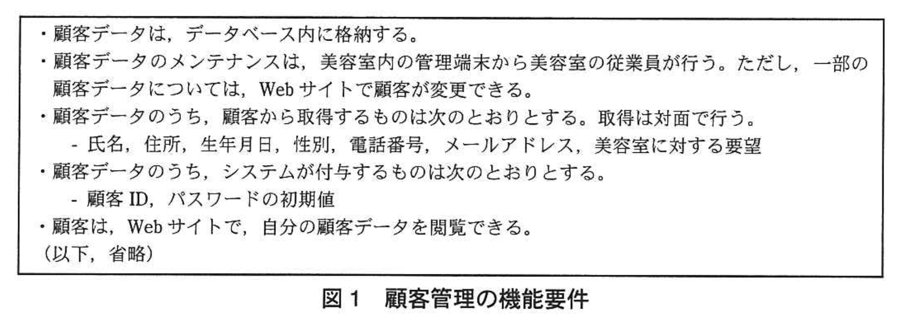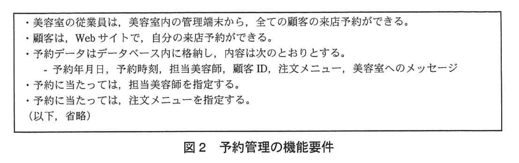M専務は、HSSの要件定義から詳細設計までを担当するグループ(以下、Sグループという)を編成し、T主任をリーダに任命した。Sグループは、HSSの想定契約先に関する調査などを行い、機能要件の定義を行った。そのうち、顧客管理と予約管理に関する機能要件は、それぞれ図1、図2のとおりである。