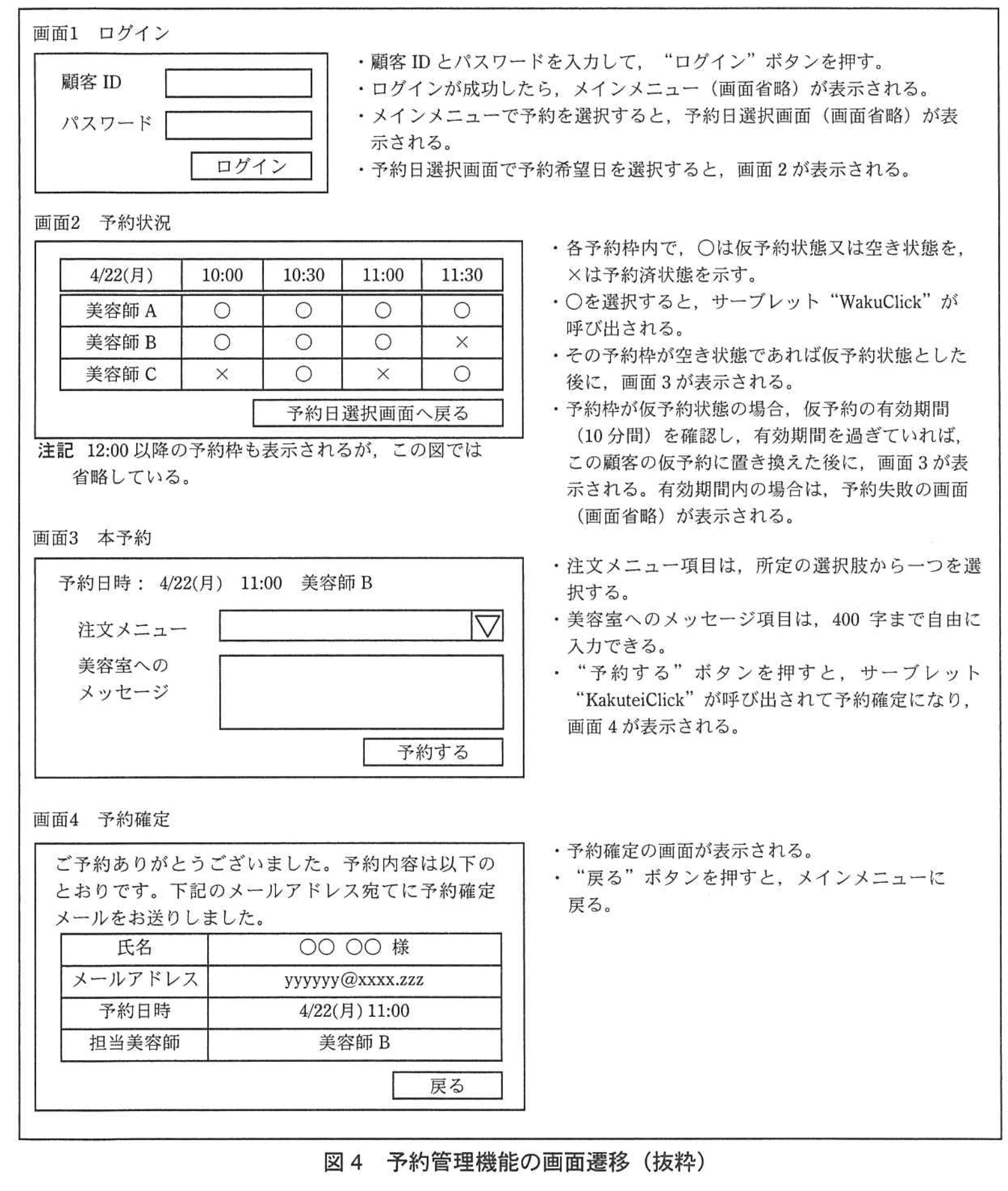 その後、HSSの開発は順調に進み、予約管理機能のうち、顧客が操作する画面の機能テストを開始した。予約管理機能の画面遷移を図4に示す。
