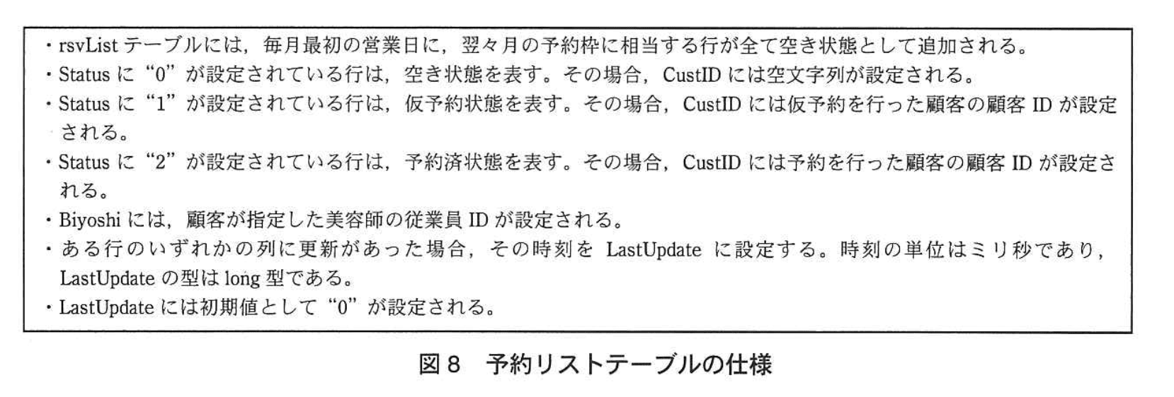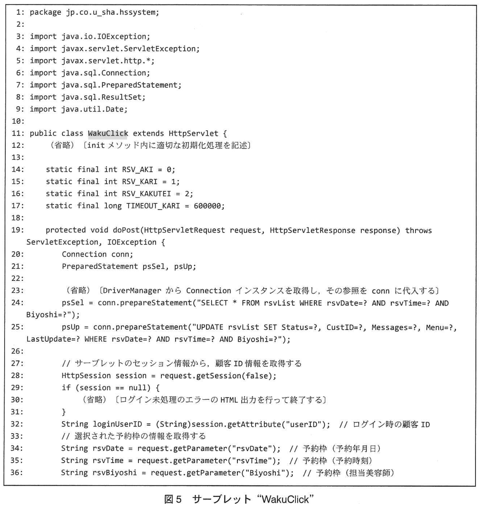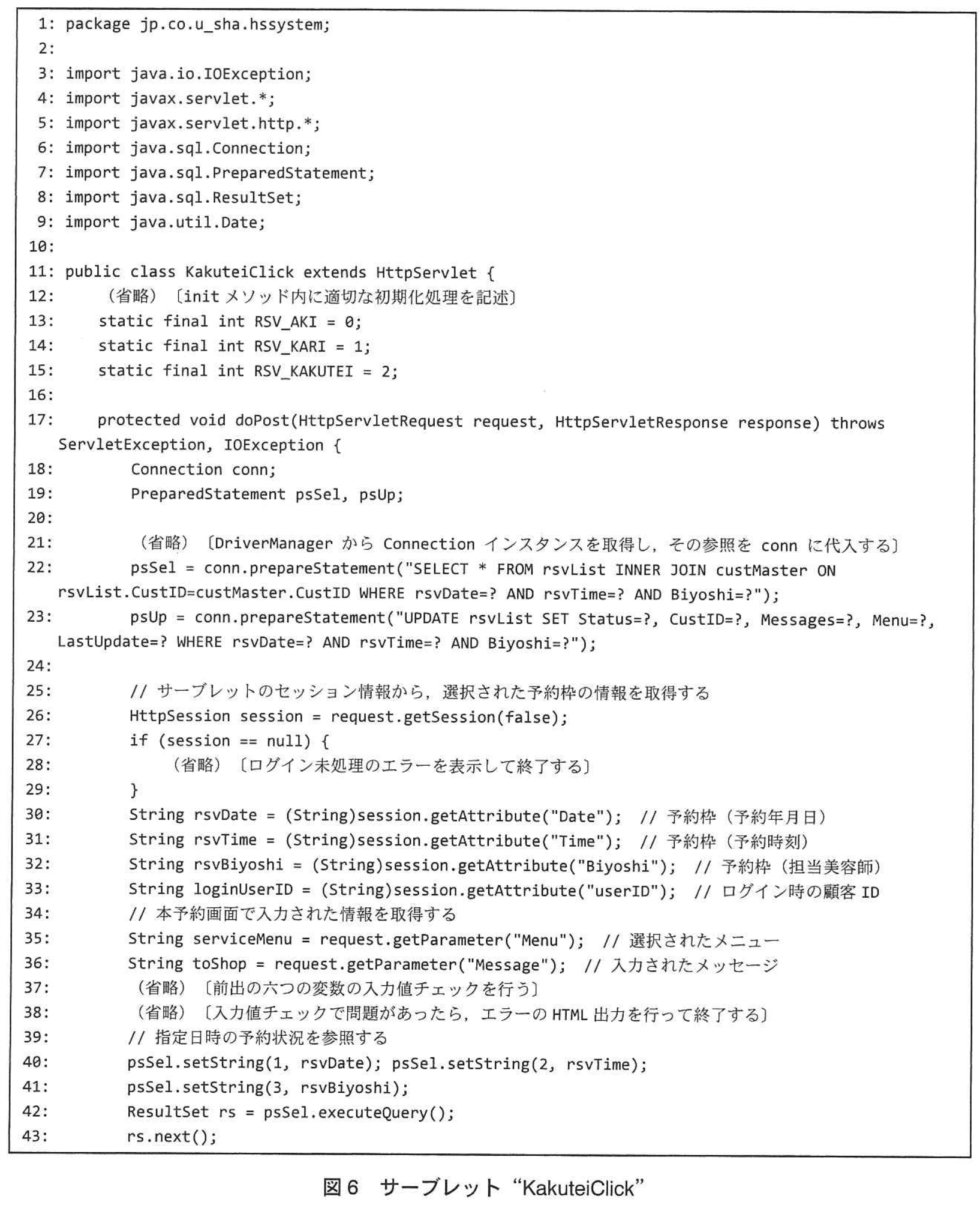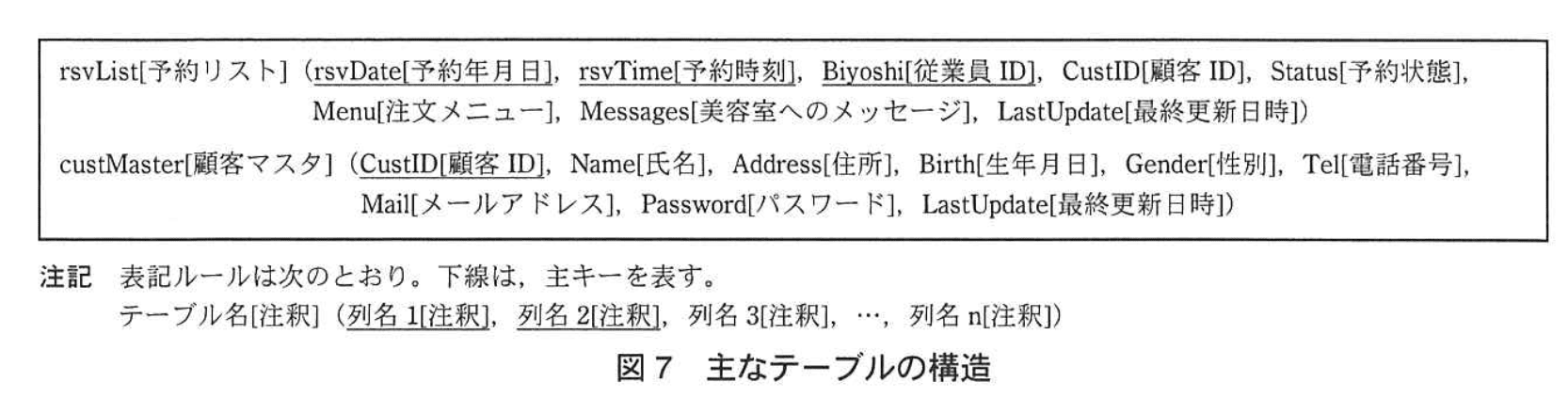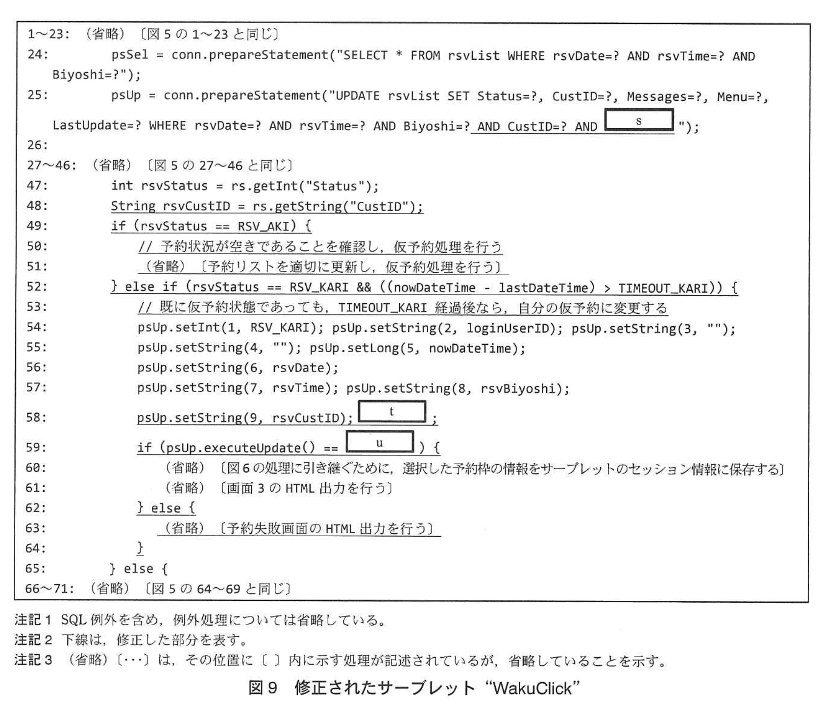 - 図9の25行目では、従来の WHERE rsvDate=? AND rsvTime=? AND Biyoshi=? AND CustID=? AND s という形で 4 つの主キー相当列に加えて s が必要です。