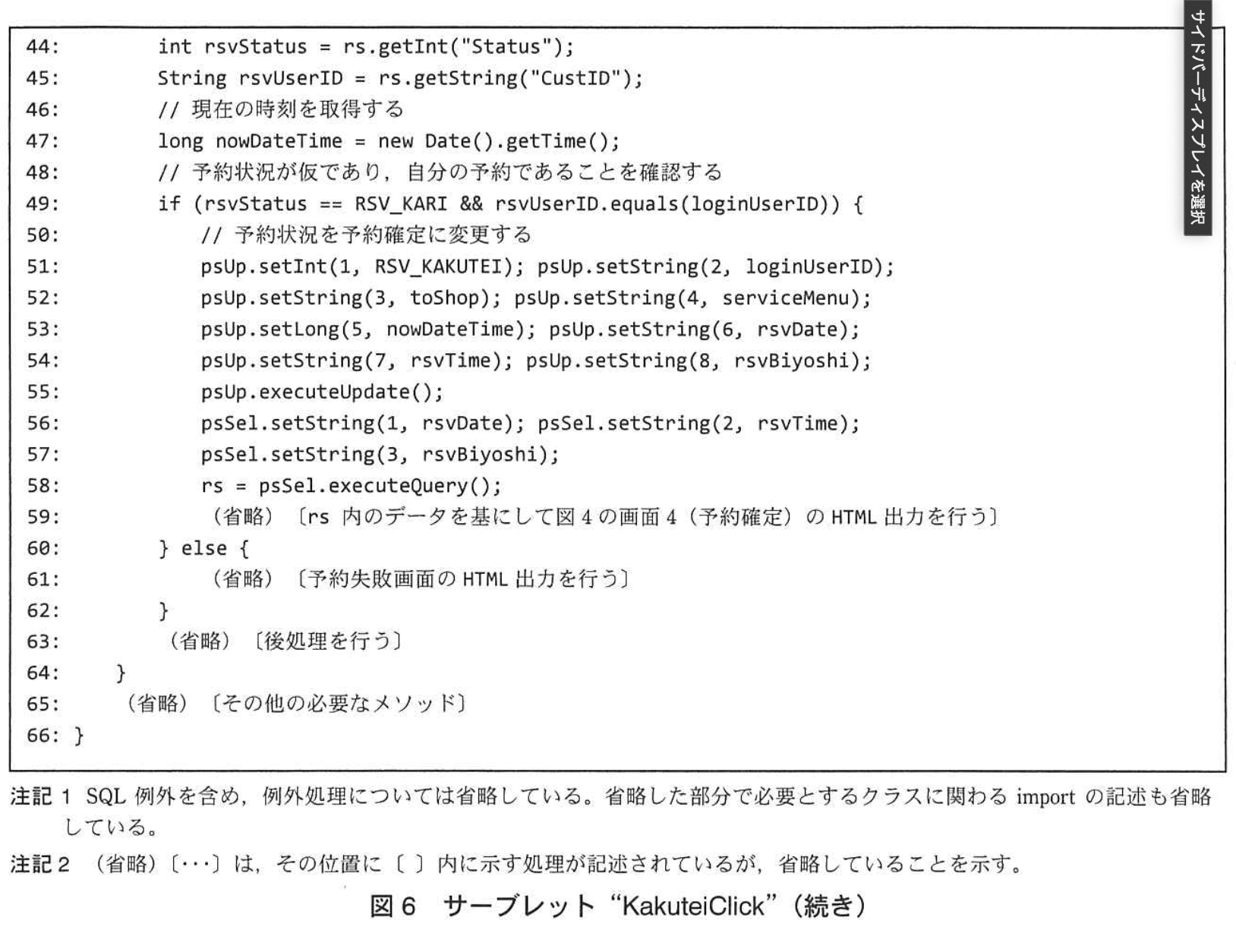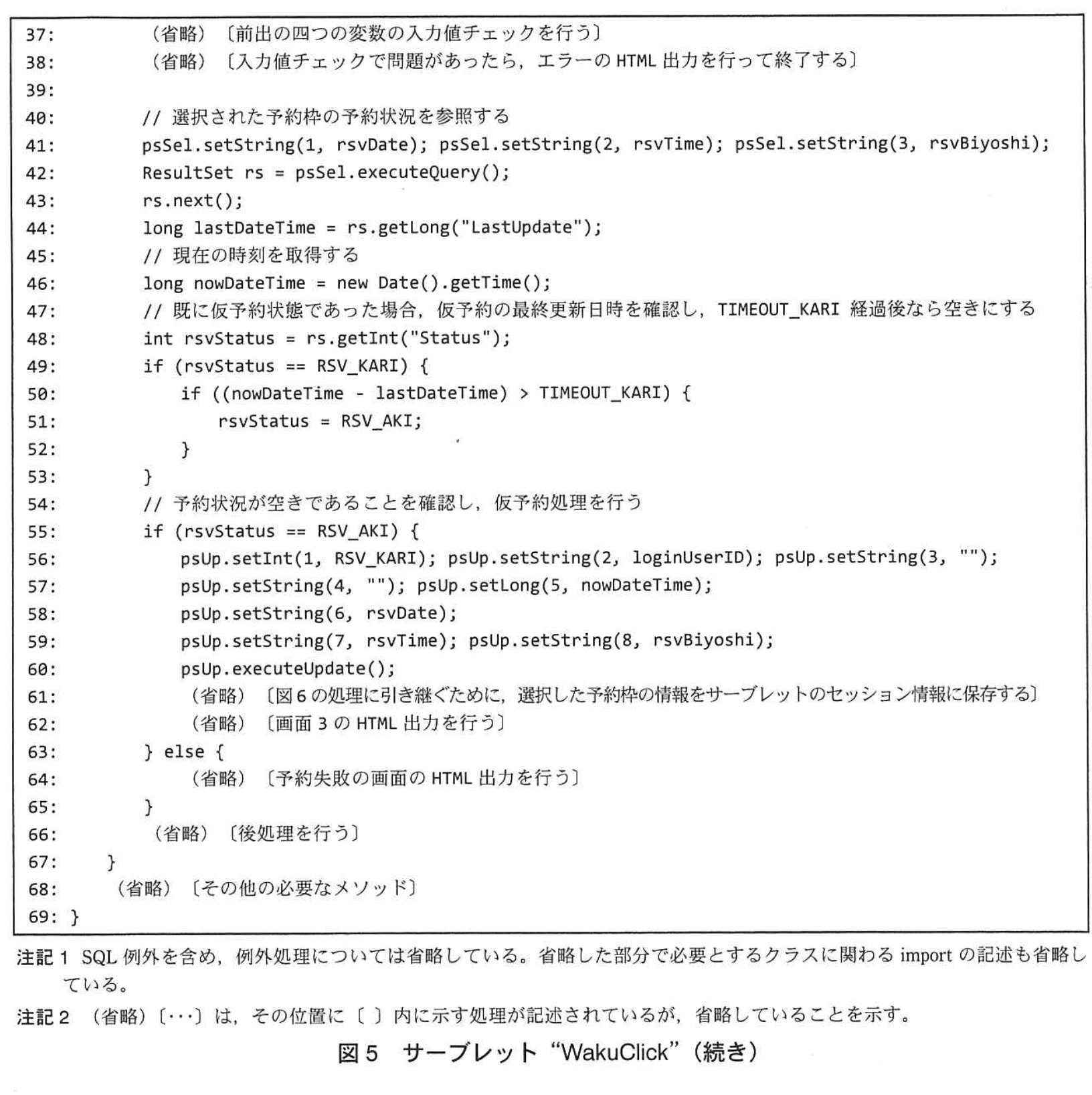 - 楽観的ロックに使える列は、読み込み時点で値が分かっており、その後の並行トランザクションが変更する可能性がある列です。図5の48行目では rsvStatus、44行目では lastDateTime を取得しています。