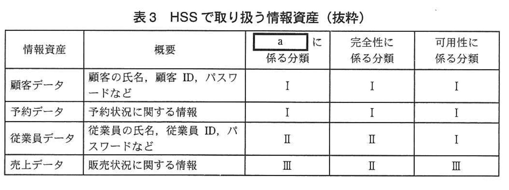 (2) 表3のように、HSSで取り扱う情報資産を特定し、情報セキュリティの3要素に照らして情報資産の分類を行った。