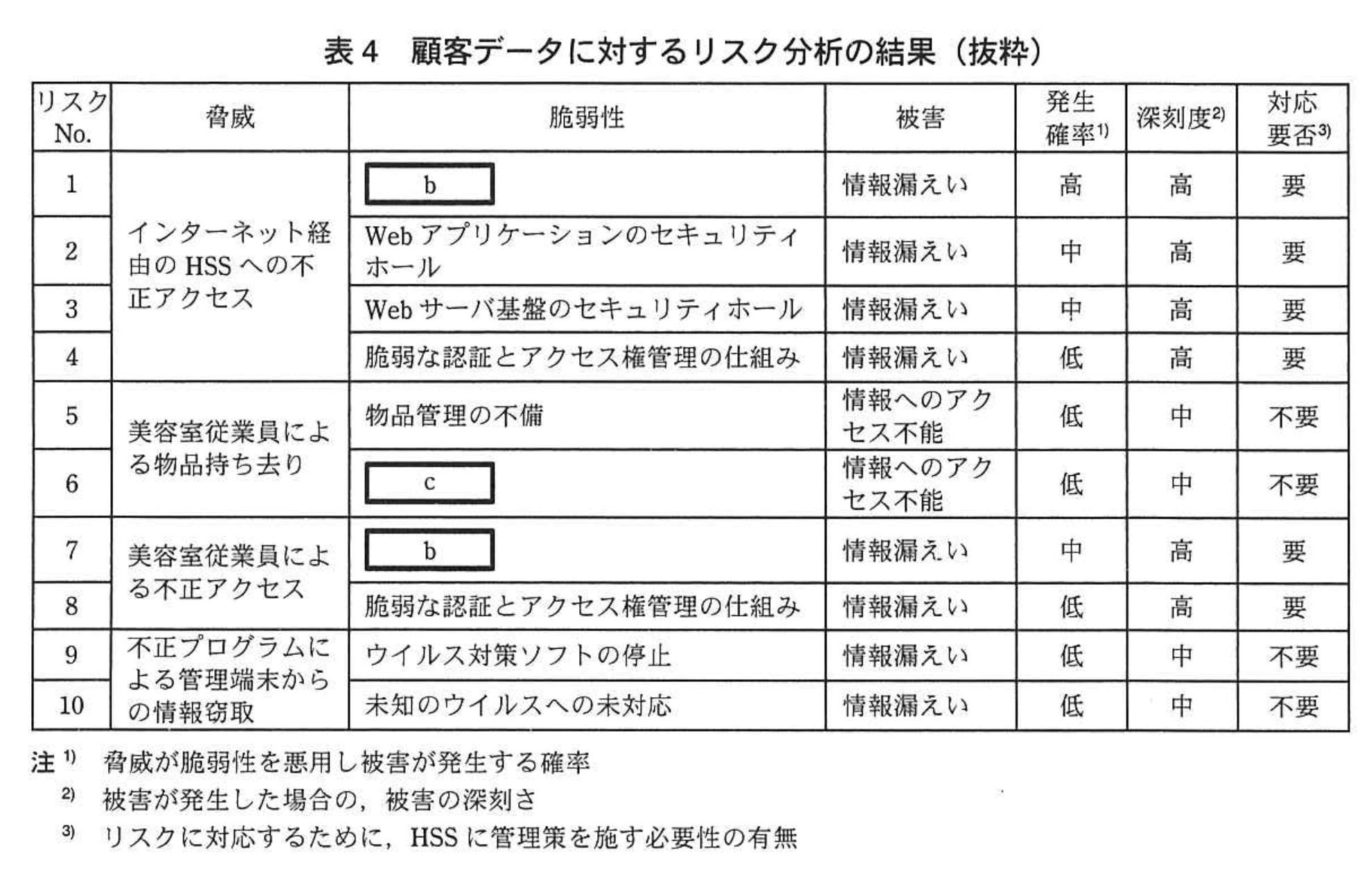 (3) 各情報資産に対する脅威と脆弱性を特定し、それぞれについてリスク分析を行い、その結果を取りまとめた。そのうち、顧客データに対する結果を表4に示す。