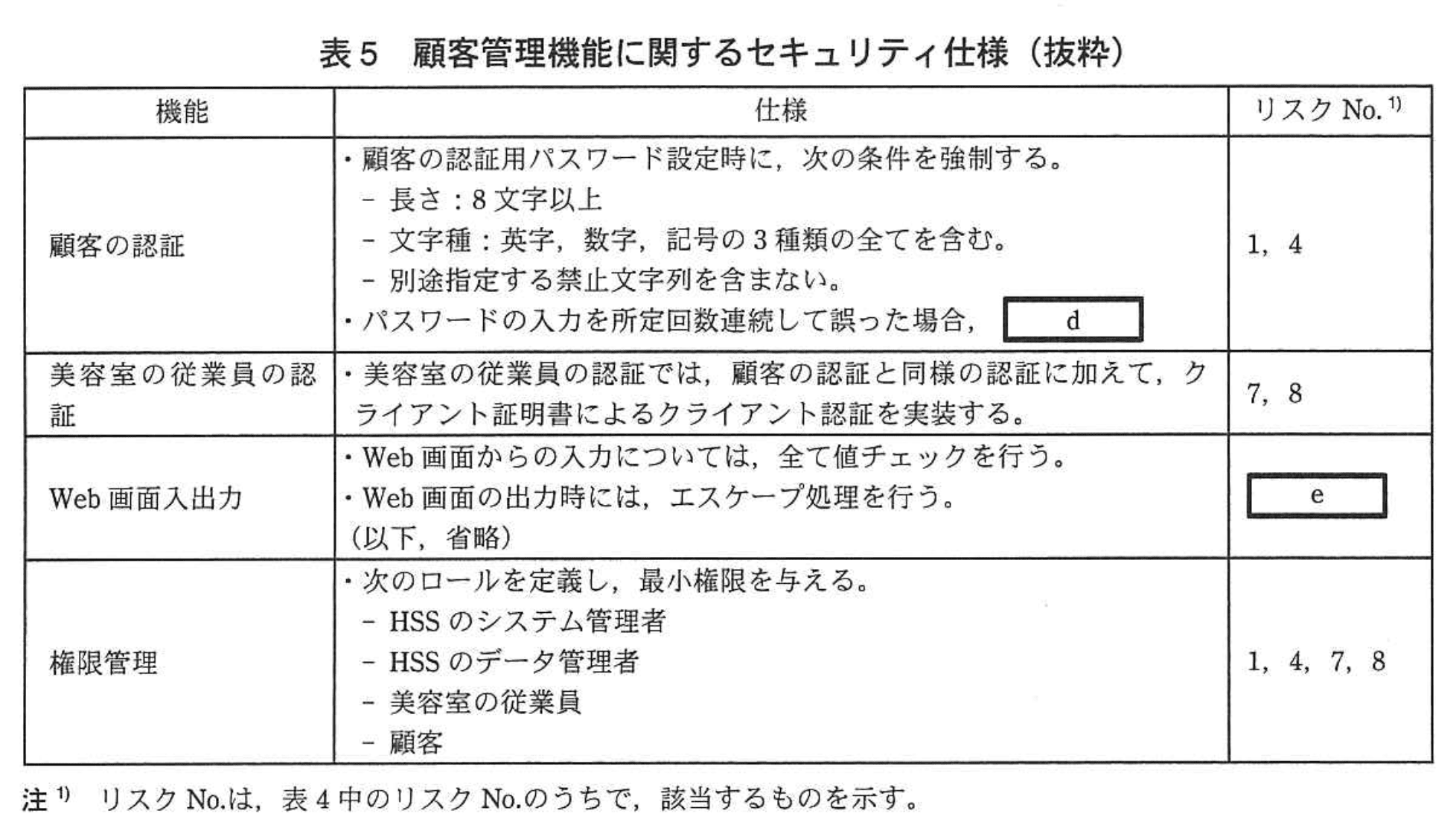 Rグループはリスク分析の結果から、Webアプリケーションに係るセキュリティ仕様とHSSの運用管理に関する要件を取りまとめた。そのうち、顧客管理機能に関するセキュリティ仕様を表5に、HSSの運用管理に関する要件を表6に示す。