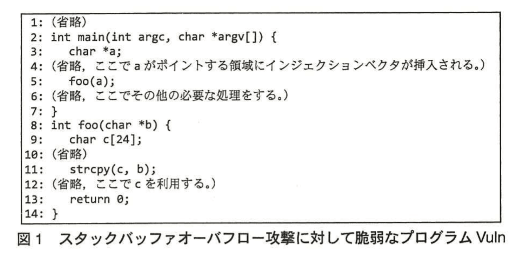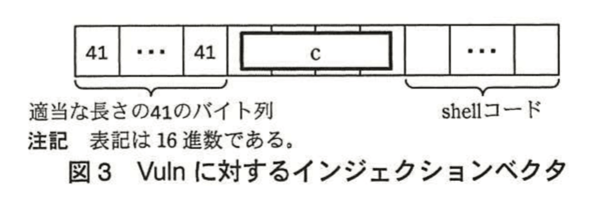 図1は、スタックバッファオーバフロー攻撃に対して脆弱なプログラム(以下、Vulnという)である。図2は、関数fooが呼び出された後のメモリ配置である。ここで、図2中のshellコードは、攻撃者がスタックバッファオーバフロー攻撃によってメモリ上に配置するものである。スタック破壊検知機能を含めずにコンパイルしたVulnにおいては、攻撃を成立させるために挿入するデータ(以下、インジェクションベクタという)を変数aに与えることによって、shellコードにプログラムの制御が移ってしまう。ここでは、図3がVulnに対するインジェクションベクタである。その際、Vulnが実行時に②一定の条件を満たせば、あらゆる命令の実行がshellコードで可能となる。