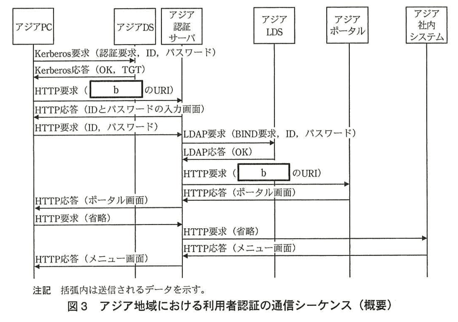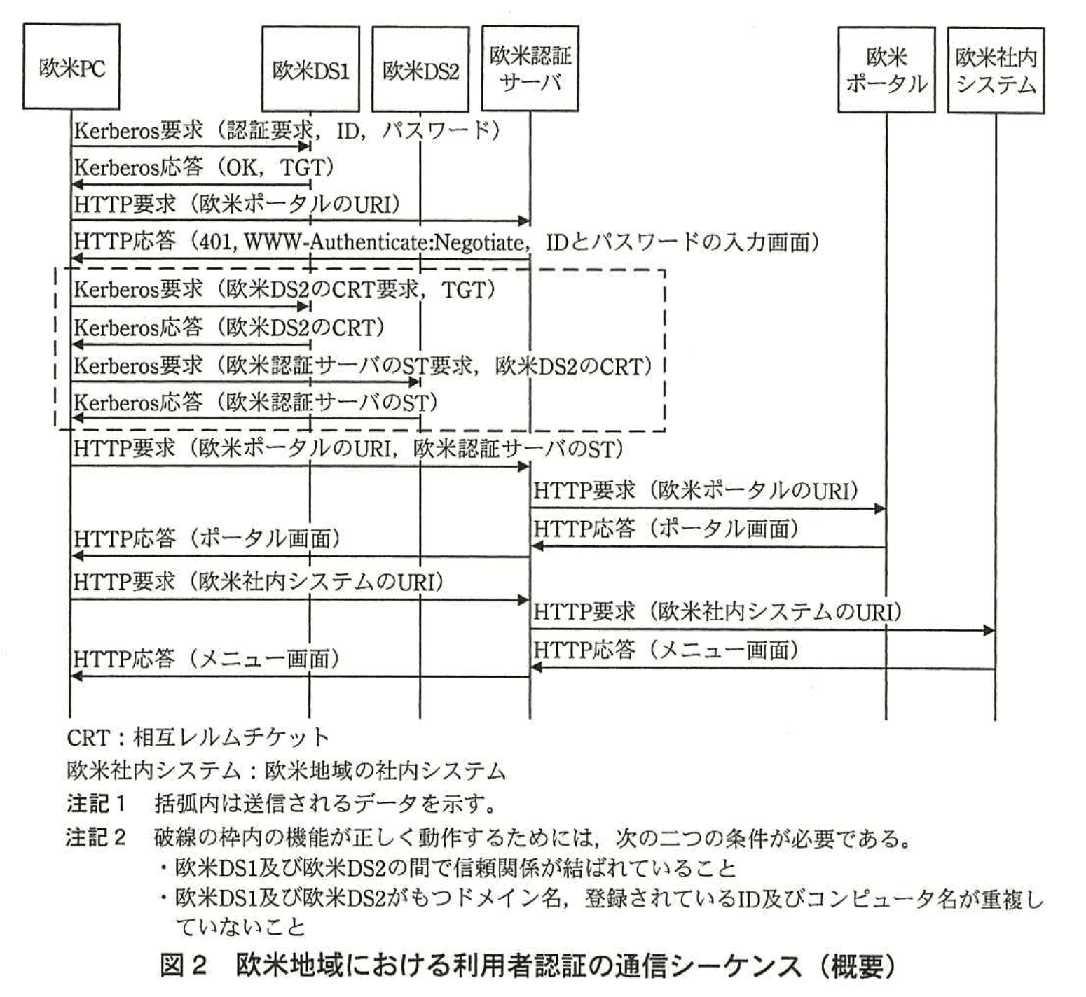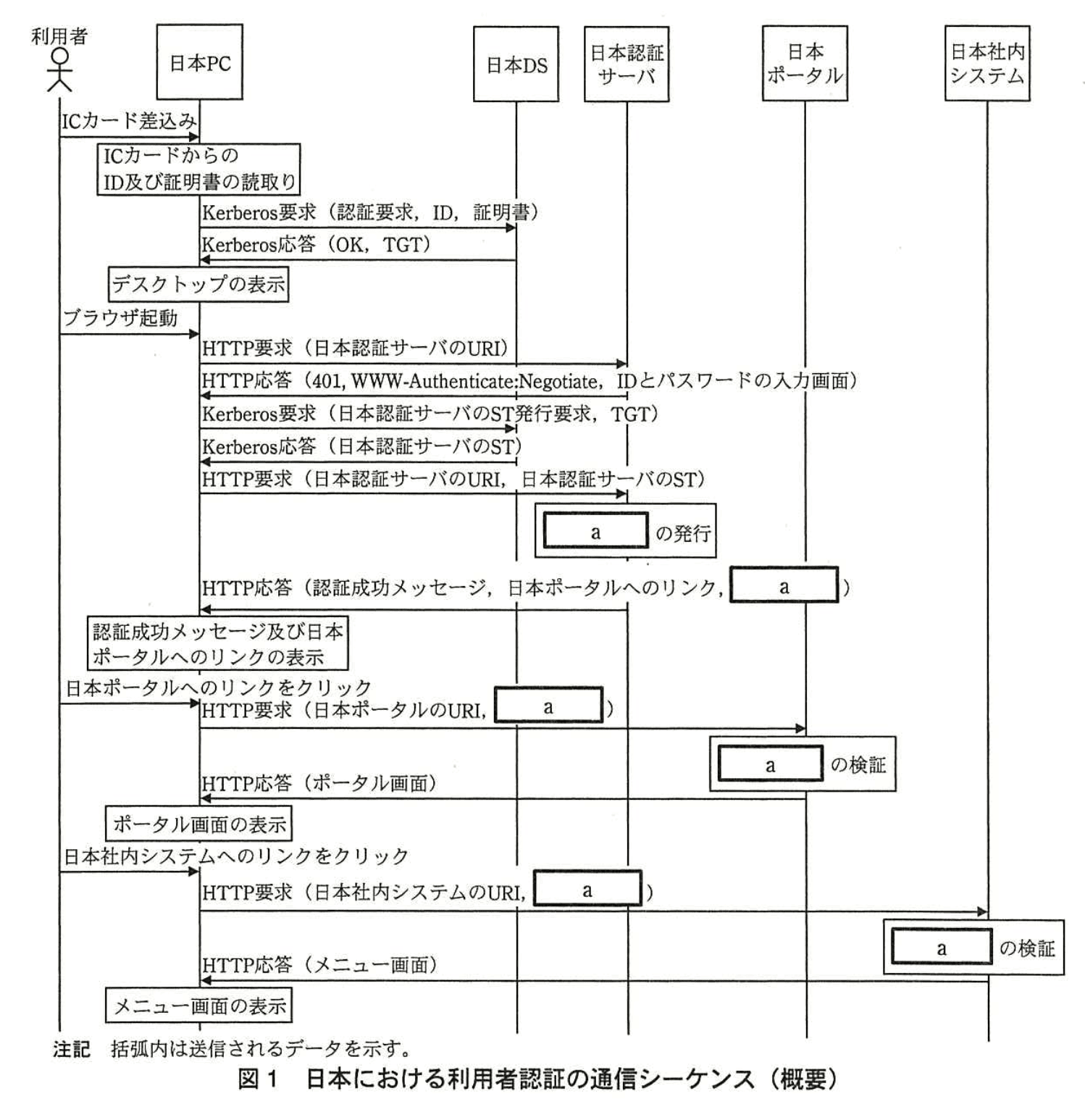 利用者が日本PCのブラウザを起動すると、ブラウザは、ホームページとして設定された日本の認証サーバ(以下、日本認証サーバという)にアクセスする。日本認証サーバは、認証していないブラウザからのHTTP要求に対して、HTTPステータスコード401、Negotiateの値をもつWWW-Authenticateヘッダ、並びにID及びパスワードの入力画面を含むHTTP応答を返す。そうすると、ブラウザは、日本認証サーバのアクセスに必要なサービスチケット(以下、STという)の提示、又はフォーム認証によるIDとパスワードの入力のどちらかを行う。日本PCのブラウザは、SPNEGOによるシングルサインオン(以下、SSOという)を利用する設定が行われており、前述のHTTP応答を受信すると、日本DSにTGTを提示してSTを受け取り、そのSTを日本認証サーバに提示して日本の社内システム(以下、日本社内システムという)における利用者認証が成功する。STには暗号化されたIDが含まれており、STを受け取ったサーバは、復号処理によってIDを得ることができる。