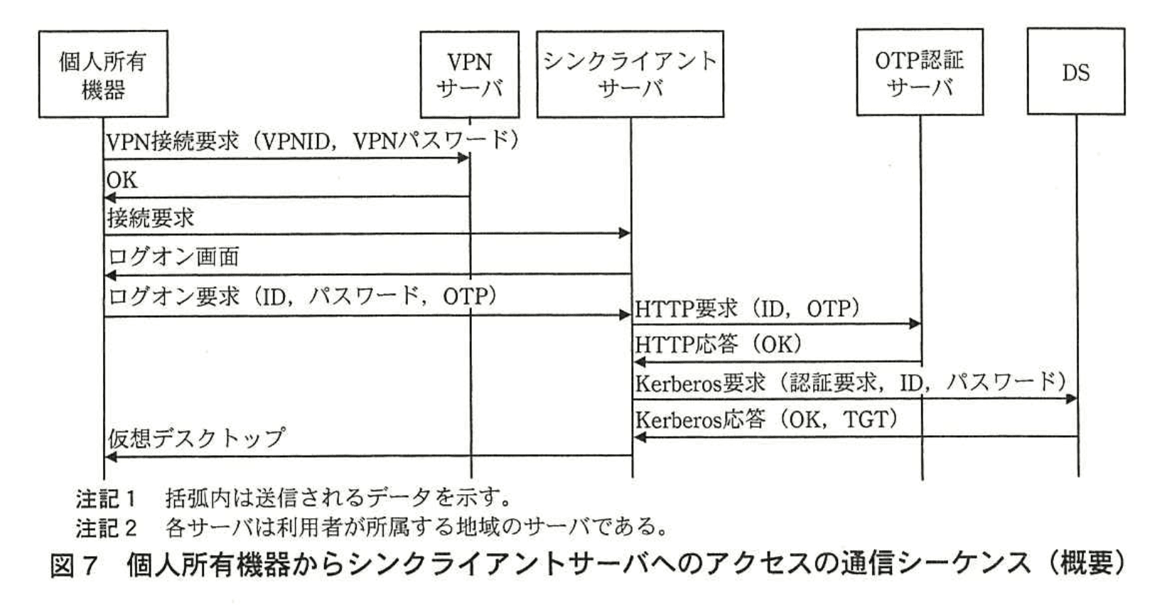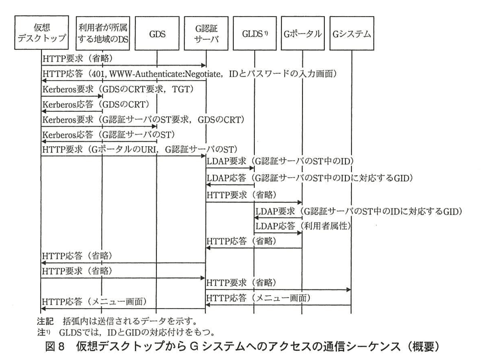 拡張GIAMシステム及び関連システムの論理構成を図6に、個人所有機器からシンクライアントサーバへのアクセスの通信シーケンスを図7に、仮想デスクトップからGシステムへのアクセスの通信シーケンスを図8に、それぞれ示す。