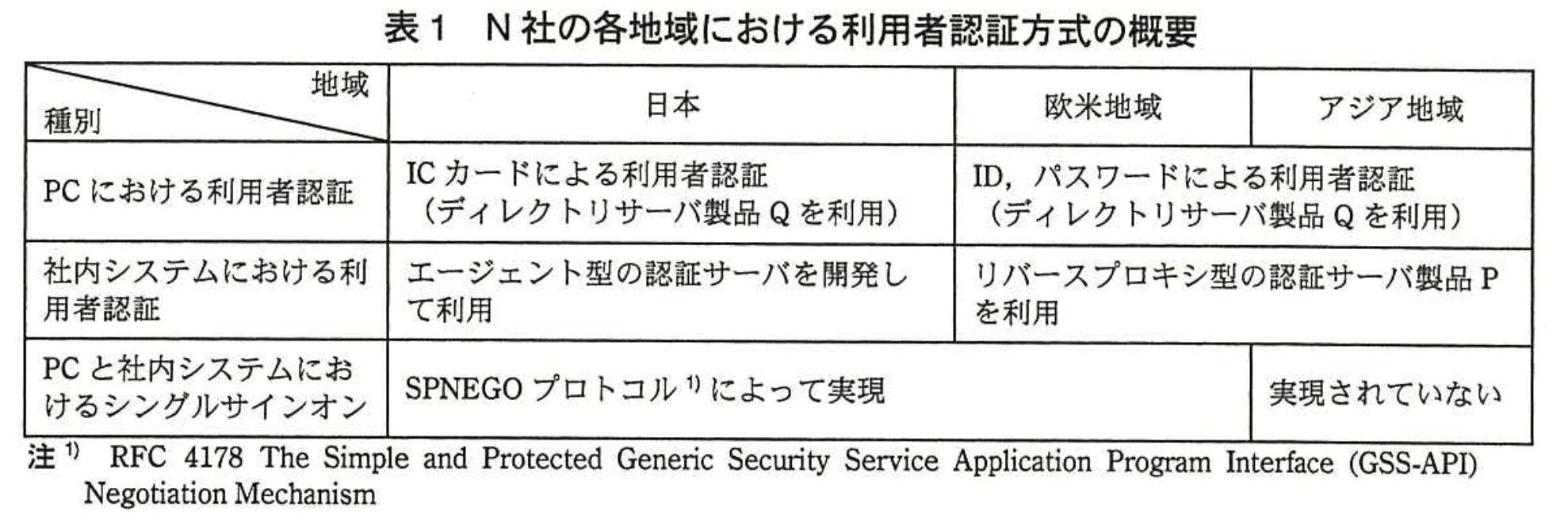 - アジア地域:本文に「“アジア認証サーバは、SPNEGOではなくフォーム認証を利用しており、アジア地域のPC…にSPNEGOの設定はされていない。”」と明示されています。また表1には「PCと社内システムにおけるシングルサインオン ― “実現されていない”」とあります。