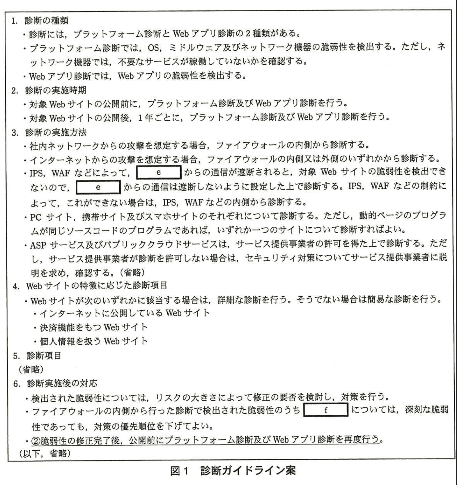 U課長は、セキュリティ専門家の協力を得て診断ガイドラインを作成するようPさんに指示した。1か月後、図1に示す診断ガイドライン案が作成された。