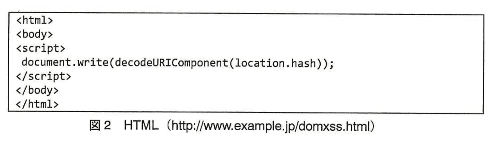 例えば、図2に示すHTML(http://www.example.jp/domxss.html)があった場合に、図3に示すURIにブラウザからアクセスすると、“1”という警告ダイアログが表示される。