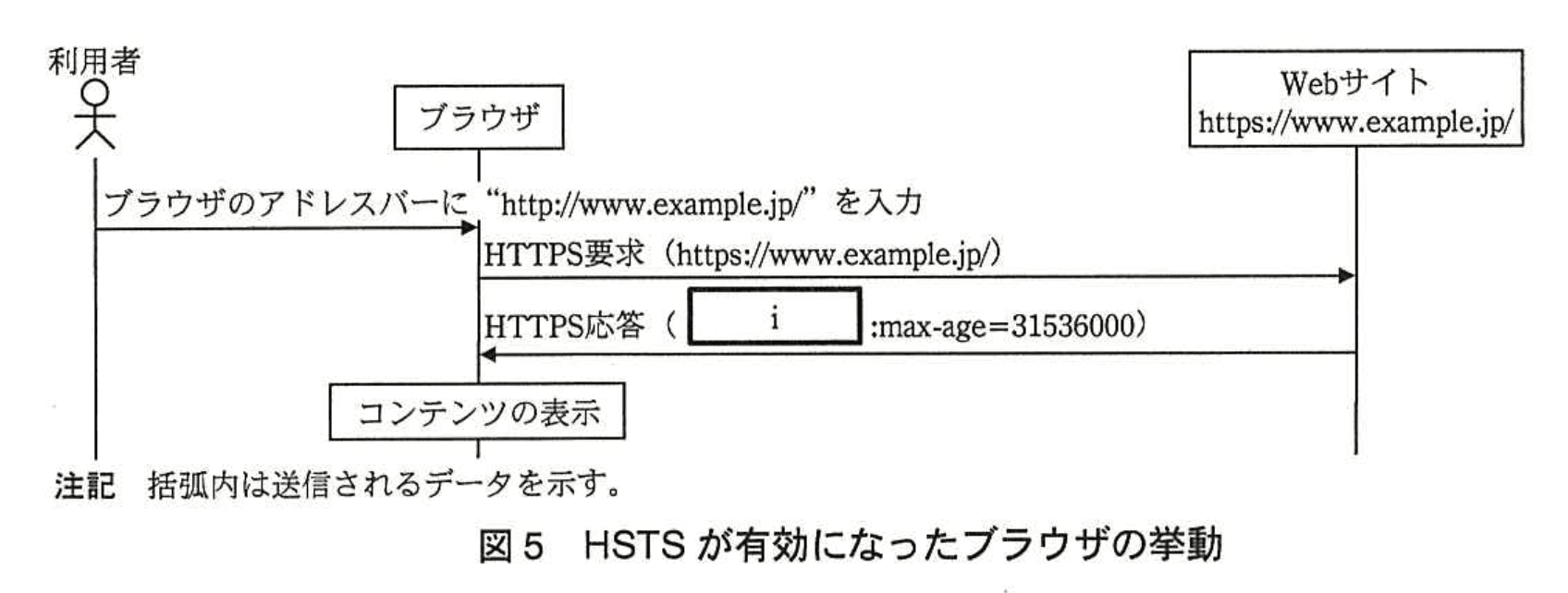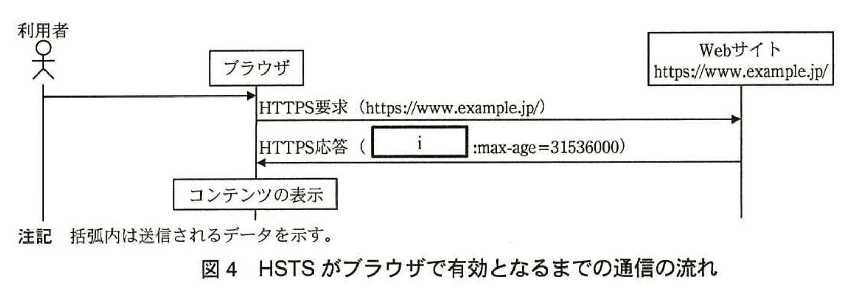 とあり、図4では「HTTPS要求 → HTTPS応答(i: max-age=31536000)」のやり取り後にブラウザがHSTSを記憶すると示されています。 - つまり、ユーザのブラウザは“最初に”対象サイトへHTTPSでアクセスし、Strict-Transport-Security ヘッダ(i)を受信して初めて強制機能を学習します。
