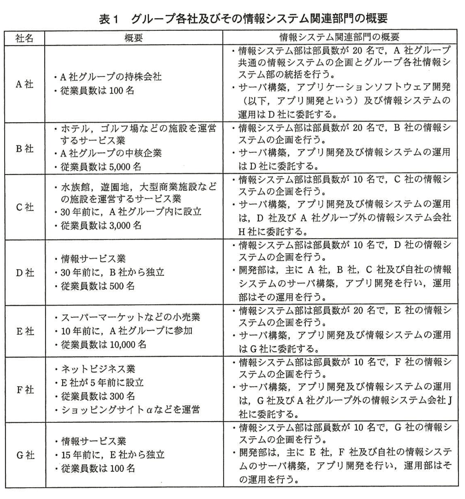 A社グループは、サービス業、小売業、ネットビジネス業及び情報サービス業のA社~G社の7社から成る企業グループである。A社を含むグループ各社が運営しているWebサイトは、企業情報サイト、BtoCサービスサイト、BtoBサービスサイト、一時的なキャンペーンサイトなど、様々である。グループ各社及びその情報システム関連部門の概要を、表1に示す。