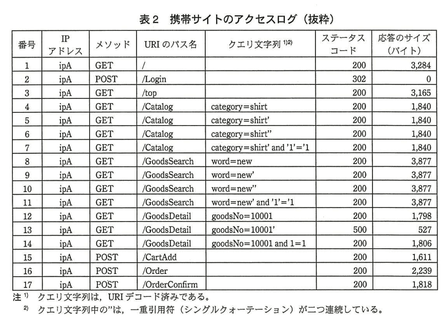 T氏 :はい。表2に示す、携帯サイトのアクセスログを見てください。Webサーバのアクセスログのうち、前回メンテナンス以降の部分について確認したところ、特定のIPアドレスから27画面に対して、SQLインジェクションの代表的なパターンが試行されていました。このうち、ステータスコードが200であり、かつ、応答のサイズが通常のアクセス時と比較してaであるアクセスログの番号bを見つけることができます。このログから、脆弱性があると考えられるURIのパス名はcであり、クエリ文字列中のパラメタ名はdであることが分かります。