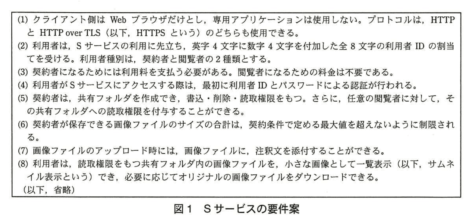 B社では、P主任を中心としてSサービスの要件を検討した。検討の結果、P主任はSサービスの要件案を図1に示すとおりまとめた。