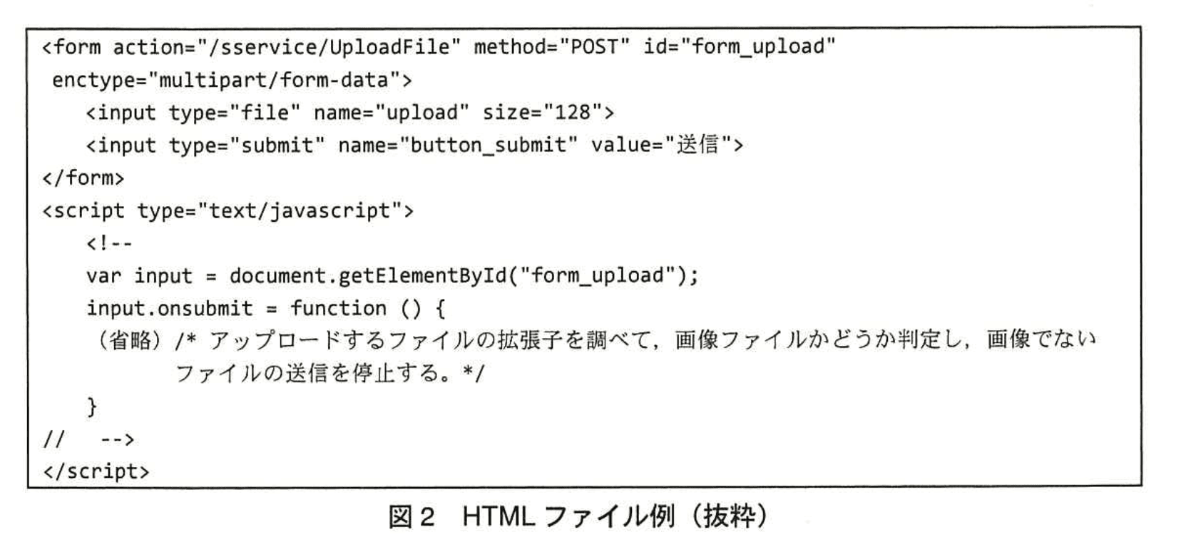 更に基本設計が進む中で、実行形式ファイルがアップロードされるとウイルスの温床になりかねないという指摘があった。議論した結果、この指摘への対策の一つとして、アップロードするファイルの拡張子を画像ファイルのものに制限することとした。制限する方式として、V君は、Webブラウザにおいてスクリプトによって判定することを考えた。この方式を実装したスクリプトを含むHTMLファイル例を図2に示す。この方式案について相談を受けたQ主任は、②契約者の操作によっては、拡張子が画像ファイルのものでないファイルがアップロードできてしまうという問題点を指摘し、制限する方式には③スクリプトによらない方式を検討するよう指示した。V君はその後、異なる方式を提案し、採用に至った。
