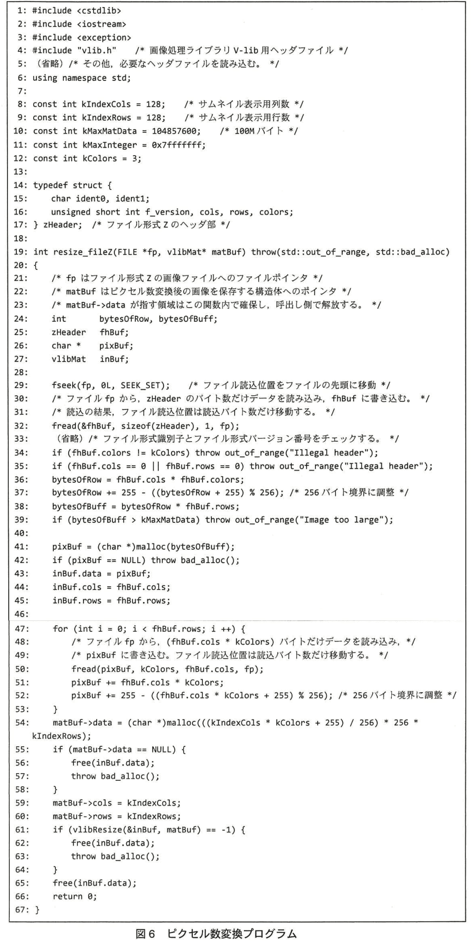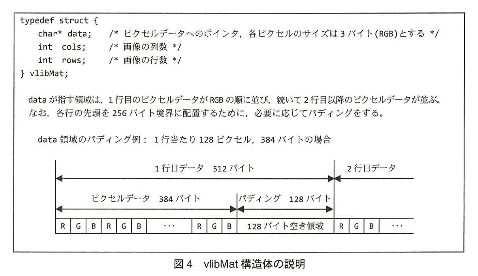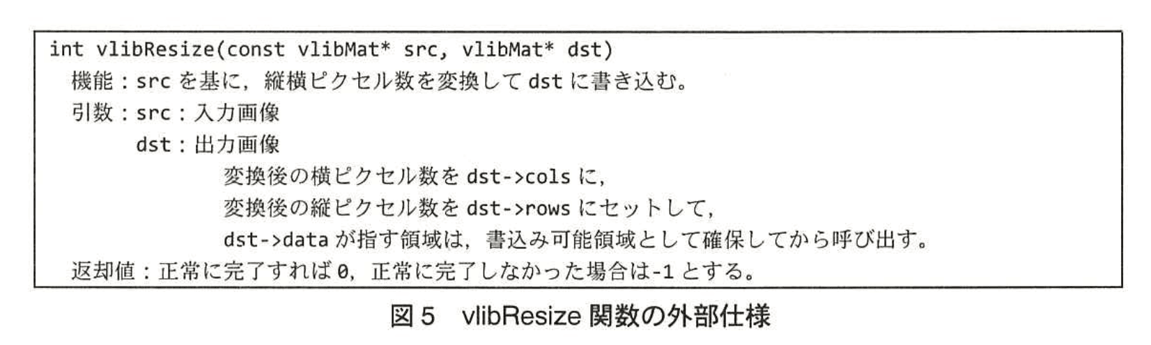 このプログラムで取り扱う、ファイル形式Zを図3に示す。ピクセル数変換そのものには、V-lib内のvlibResize関数を使用することにした。V-lib内で定義され、vlibResize関数の引数として使用するvlibMat構造体の説明を図4に示す。また、vlibResize関数の外部仕様を図5に示す。