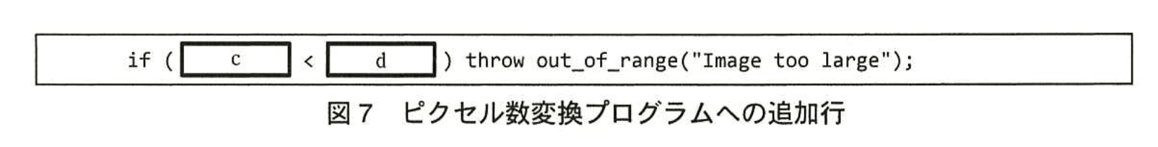 【問題文】図7ではif ( c < d ) throw out_of_range("Image too large");を 37~38 行の間に挿入し、乗算を実行する前に 桁あふれを未然に検知 させるのが狙いです。