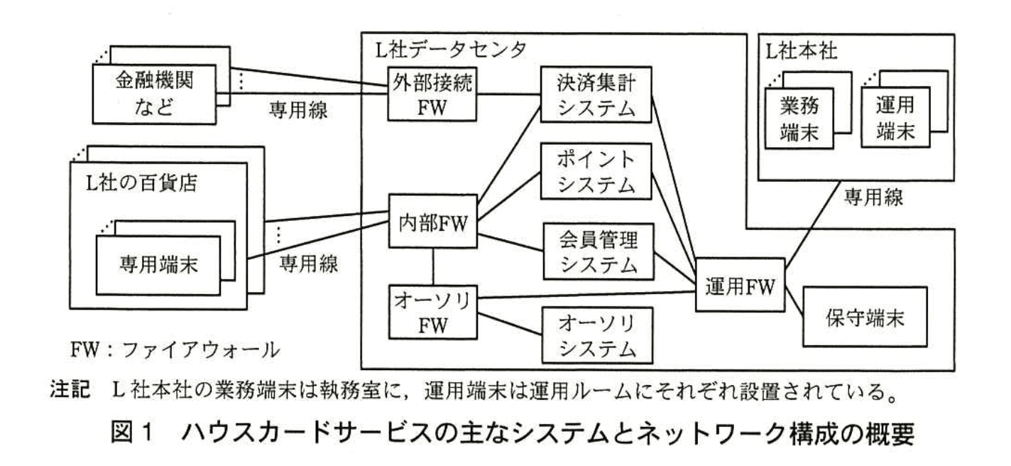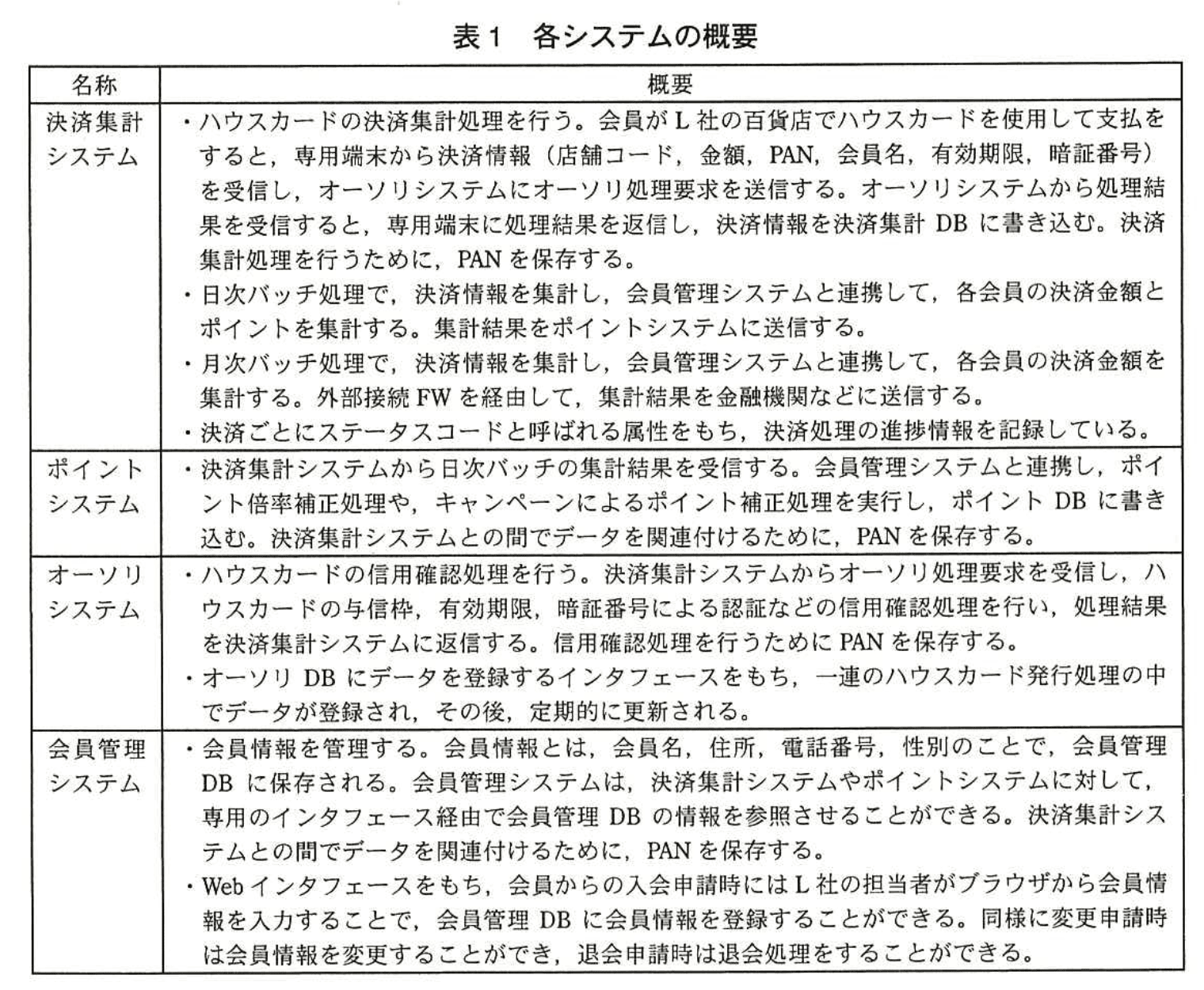 その後も、Y部長とN主任はPCIDSS要件への準拠性について確認を進め、問題がある要件については、対策計画を明確にした。また、継続的に適用範囲の正確性を確認するとともに、より限定していくという方針を定め、対策計画の内容と合わせて準拠計画書としてまとめた。準拠計画書は、提携カード検討委員会で承認された後、H社に提出された。H社からは、L社の迅速な対応と準拠計画書の内容が高く評価された。