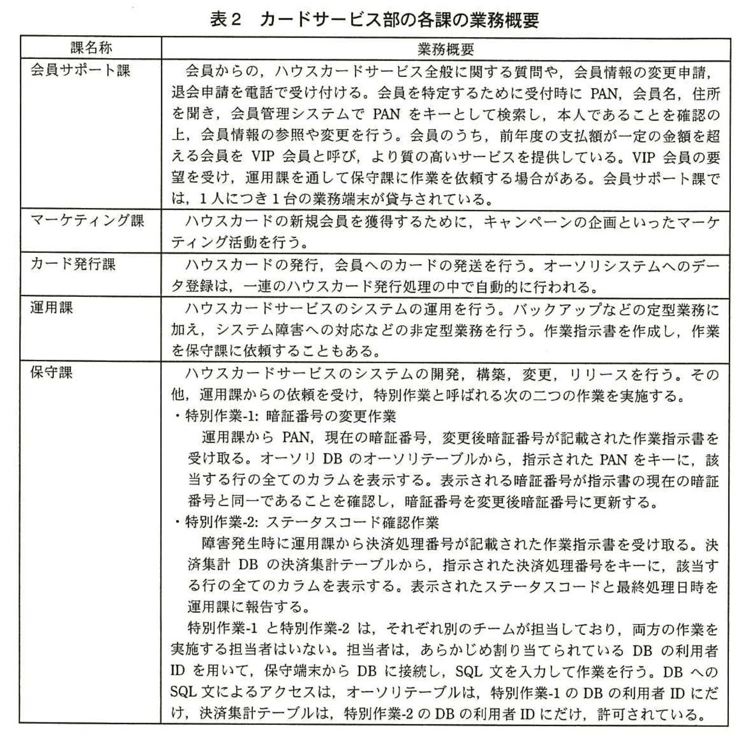 ハウスカードサービスのシステムは、L社のカードサービス部が運用している。カードサービス部の各課の業務概要は表2のとおりである。