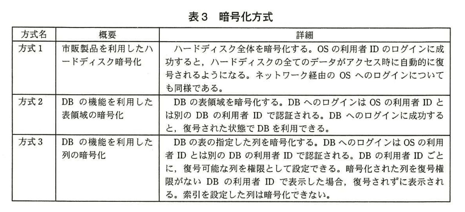 Y部長とN主任は、DBに保存するPANについて、暗号化による対策を検討することにした。N主任は表3に示す暗号化方式を選定し、検討を進めた。次は、その時の会話である。