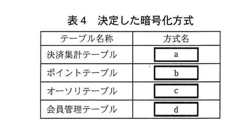 その後、N主任は検討を進め、検討結果を Y部長に報告した。提携カード検討委員会は、表4のように暗号化方式を決定した。