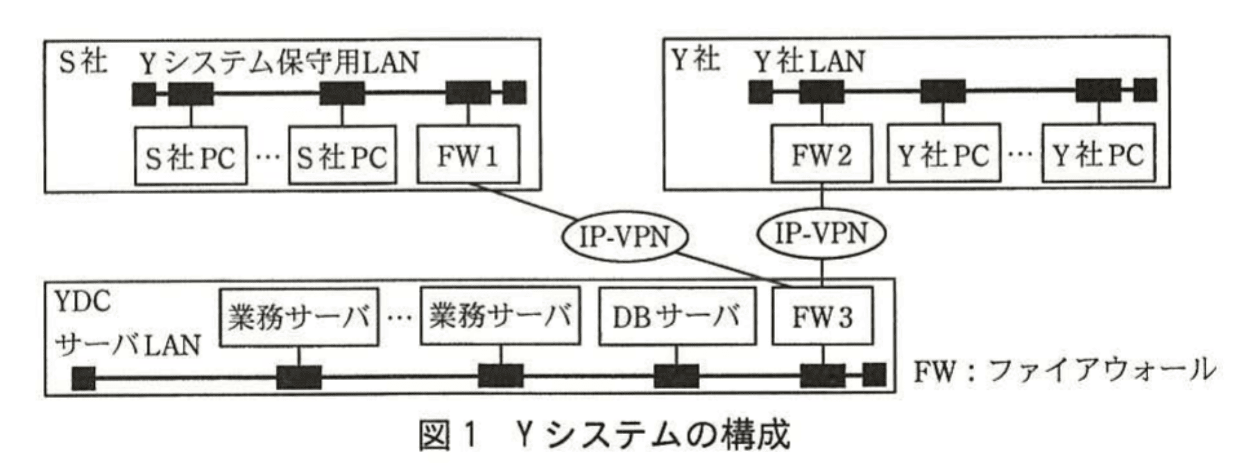 システム管理IDとDBMS管理IDのパスワードはY社が半年ごとに変更し、S社に通知している。S社PCとFW1は、S社の資産である。Yシステム保守用LANからサーバLANへのアクセスは、FW3で保守作業に必要となるプロトコルだけに限定しているが、送信元IPアドレスは限定していない。