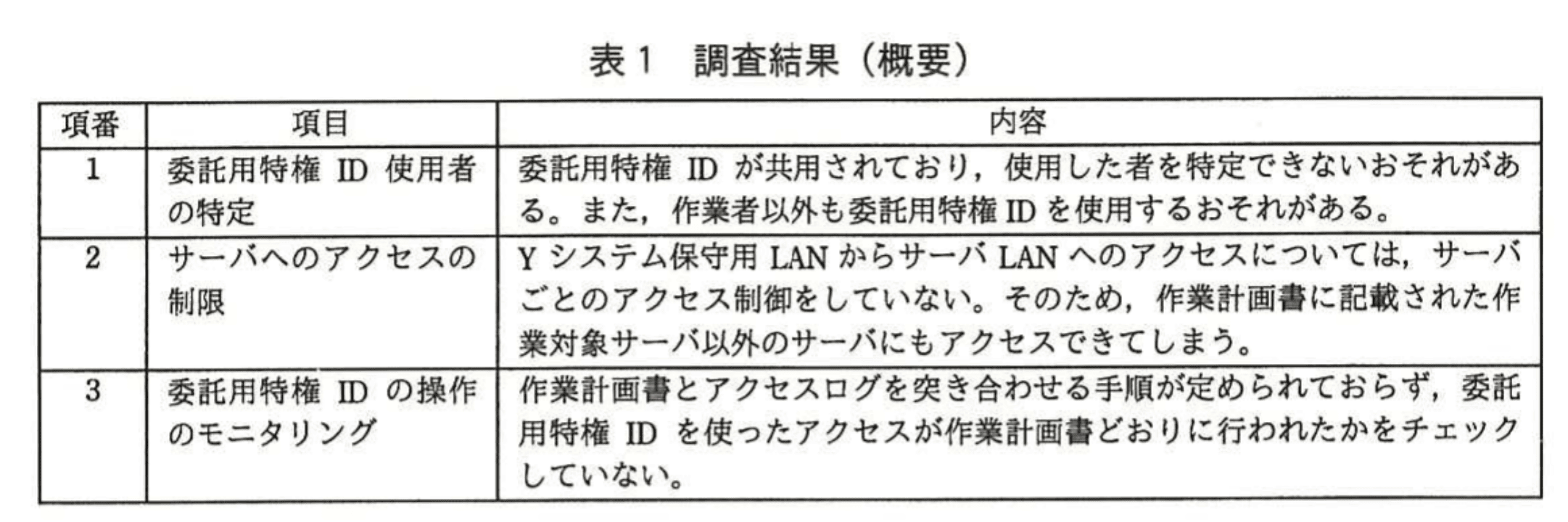 Y社と同業のC社で、C社の保守作業委託先の従業員が個人情報を不正に持ち出して名簿業者に売却するという情報漏えい事件が起きた。持出しに特権IDが不正に使用されたが、それを検知できなかったというC社の委託先管理の不備が連日報道された。Y社の経営幹部は、C社の事件をきっかけに、自社においても同様の問題が起きる可能性がないか早急に調査をするよう、情報システム部長に指示した。表1に示す調査結果にあるように、Yシステムにおいても委託用特権IDを用いた保守作業に問題があることが判明し、情報システム部のL主任がリーダとなって対策を検討することになった。
