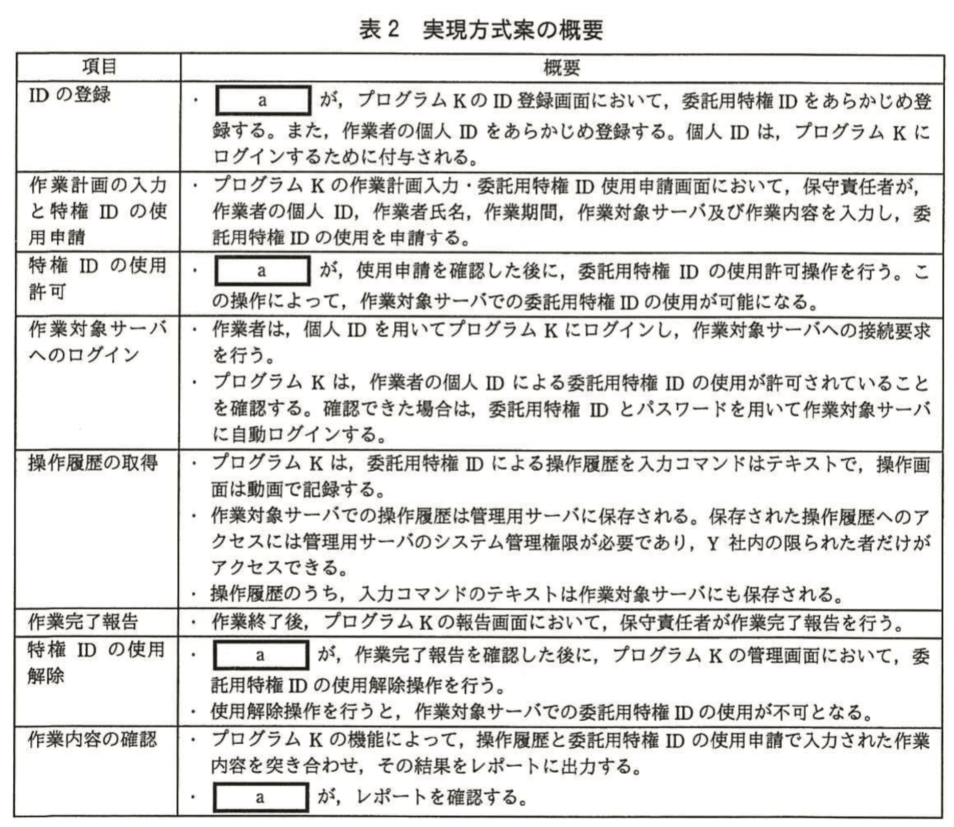 N君は、要件を満たすためには、委託用特権IDのパスワードのS社への通知の停止、個人ごとに付与され特権をもたないID(以下、個人IDという)の作業者への付与、及び特権IDを管理するソフトウェアパッケージの導入から成る対策案を考えた。