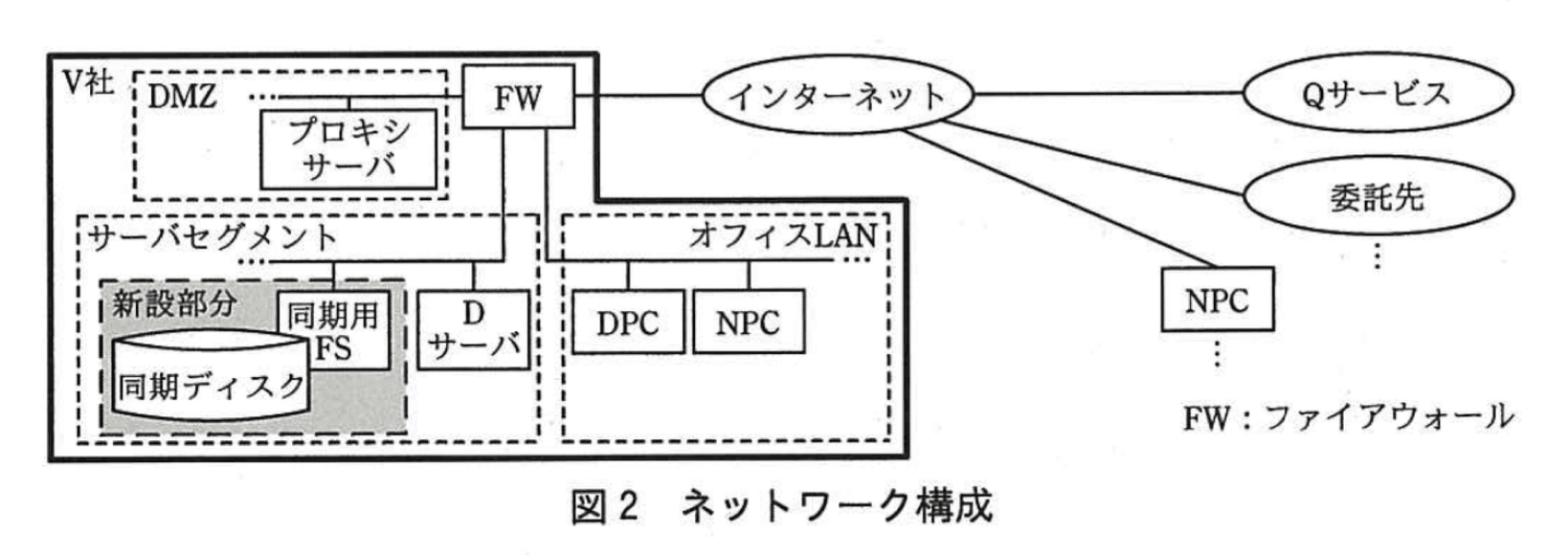 Uさんは、検討を進め、専用のサーバ(以下、同期用FSという)及び専用のディスク(以下、同期ディスクという)を介して、社内ネットワークに接続されたPCとQサービス間でのファイルの交換を行う仕組みを提案した。そのネットワーク構成を図2に、ファイル交換の仕組みの概要を図3に、同期用FSの機能の説明を図4に示す。