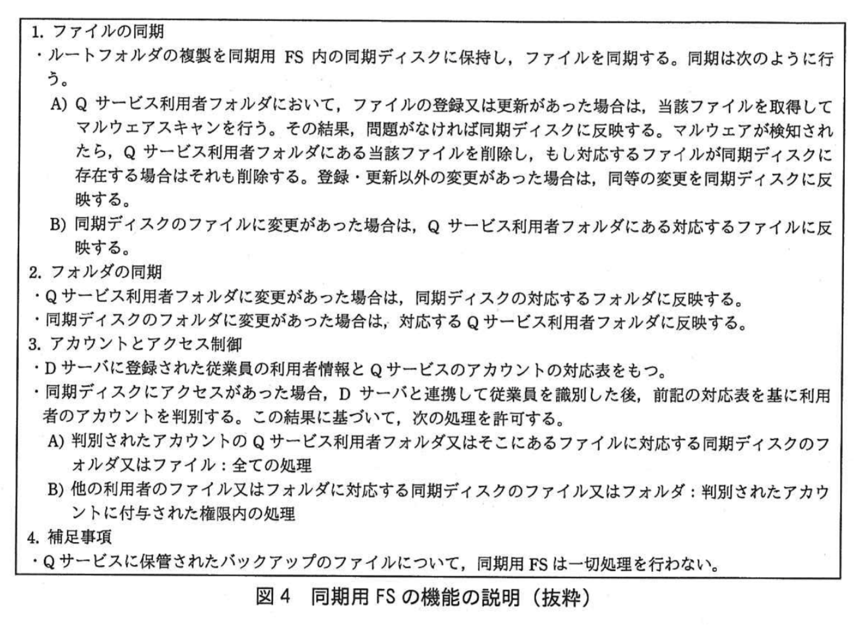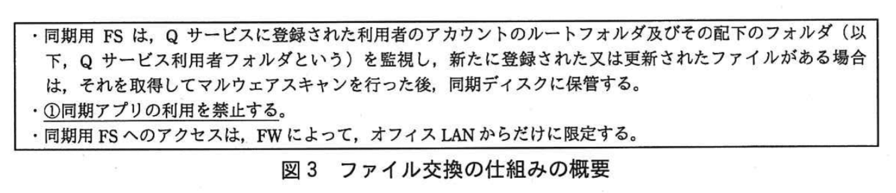 追加提案以前の同期用FSには「②試験導入において表出した問題を踏まえると…追加すべき機能がある」と指摘されています。すなわち、マルウェア検知後に“削除”する措置はあっても、その事実を周知する仕組みが欠けていました。 - 必要な追加機能