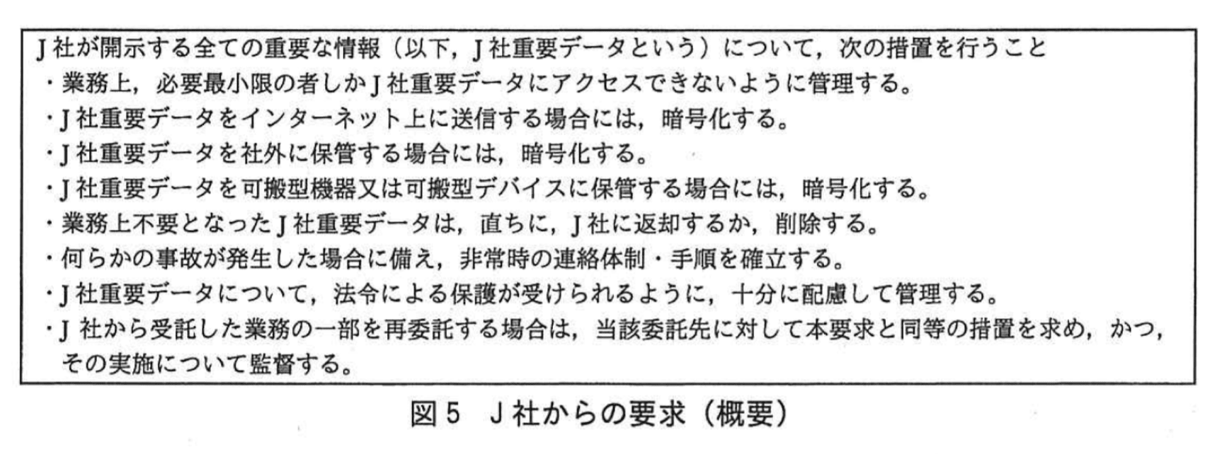 V社で Qサービスの利用を開始してから 1年が経過した頃、重要な顧客である J社から、情報セキュリティに関して新しい要求の通知があった。J社の別の委託先において、J社が開示した新製品に関する CAD データが漏えいするという事件が発生し、対策の一環として、J社が重要なデータを開示する全ての委託先に対して、新たな要求を課す方針になったとのことであった。J社からの要求を図5に示す。