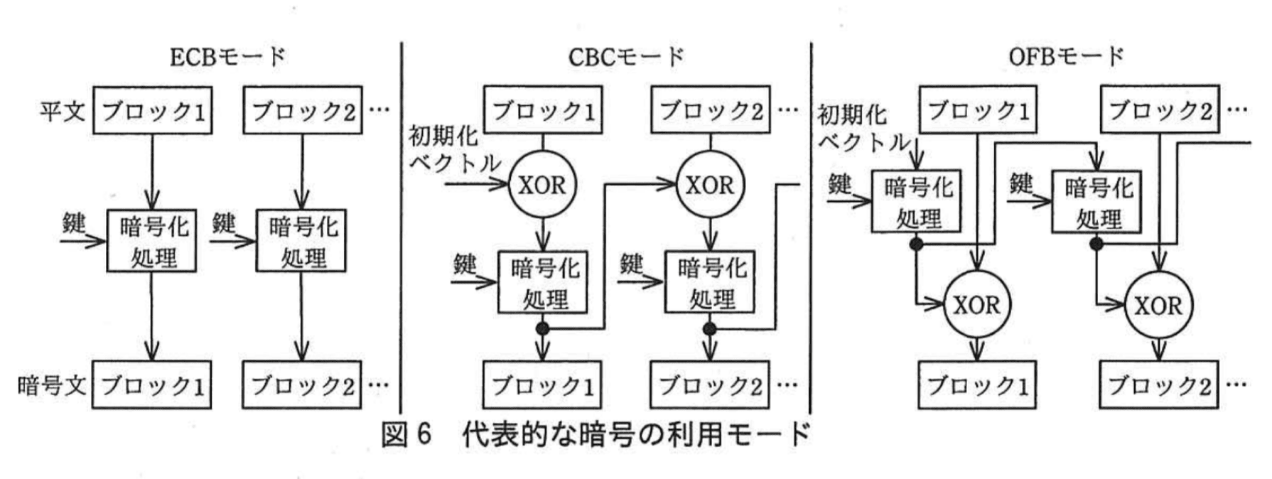 R主任:図6に代表的な暗号の利用モードがまとめられているので見てごらん。ブロック暗号アルゴリズムの利用時には、暗号化の目的や利用方法に合わせて、適切な利用モードを選ぶ必要がある。例えば、③ディスクやファイルの暗号化にECBモードをそのまま用いるのは、セキュリティ上の問題がある。利用モードによって、ランダムアクセス時の性能が大きく異なる場合もある。例えば、512バイトの平文Pを、ブロック長が128ビットのブロック暗号アルゴリズムで暗号化した暗号文Cがあり、この暗号アルゴリズムでは平文と暗号文の長さは同じとする。平文Pにおいて1,025ビット目から始まる1ブロック分のデータを修正した場合、平文Pの修正に対応して暗号文Cを修正するためには、暗号化処理を、ECBモードではi回、CBCモードではj回実行しなければならない。また、別の暗号文C’で、513ビット目から始まる1ブロック分のデータを復号するためには、暗号化処理又はその逆処理を、ECBモードではk回、CBCモードではl回、OFBモードではm回実行する必要がある。複数ブロックの並列処理は、nの場合、暗号化時は不可能だが、復号時は可能だ。oの場合は、鍵ストリームに相当するデータを事前に計算することができる。ただし、一部の利用モードは、特定の攻撃に弱いので注意が必要だ。