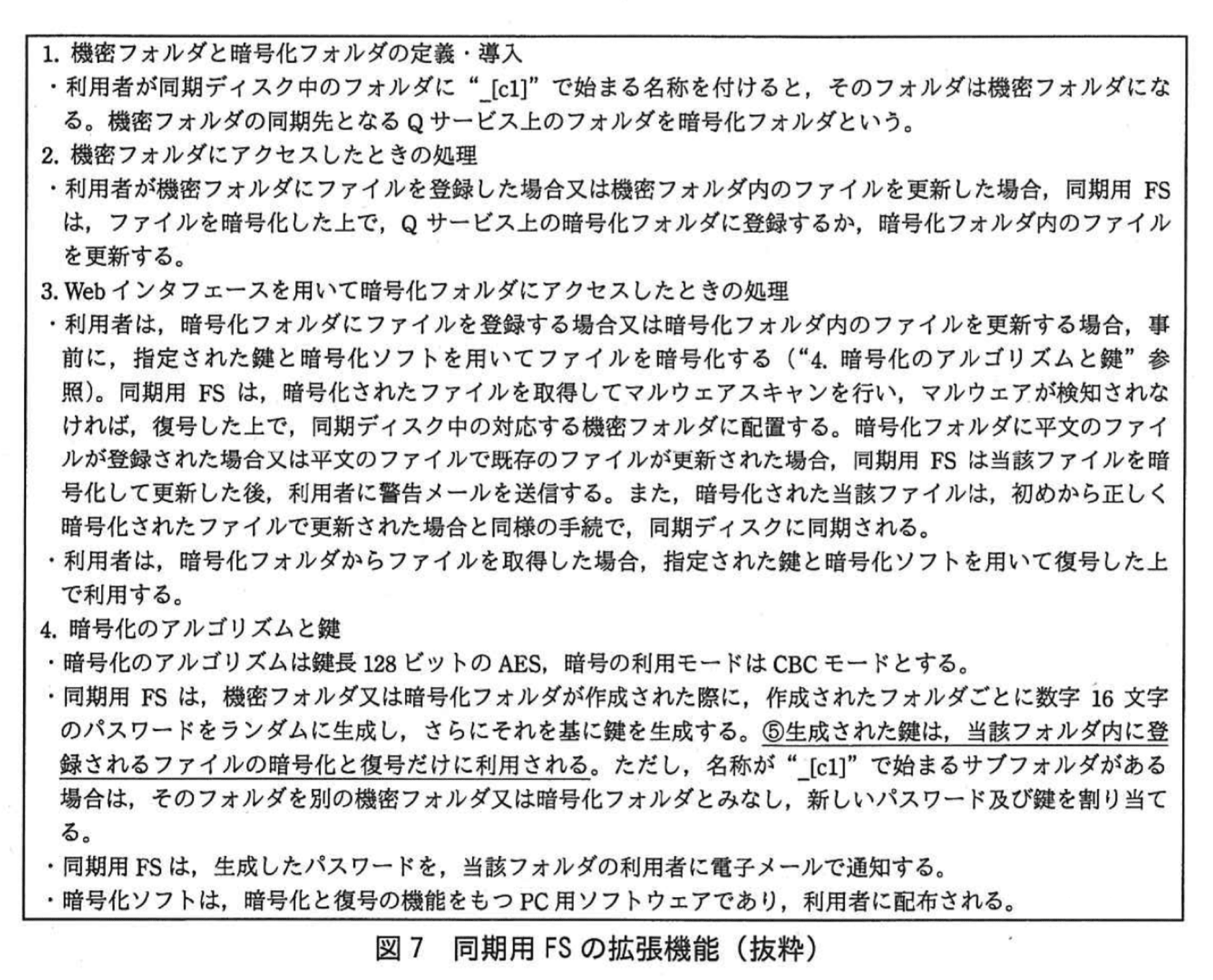図7には「同期用 FS は、暗号化されたファイルを取得してマルウェアスキャンを行い、マルウェアが検知されなければ、復号した上で、同期ディスク中の対応する機密フォルダに配置する。」と記載されています。 - 問題点の抽出