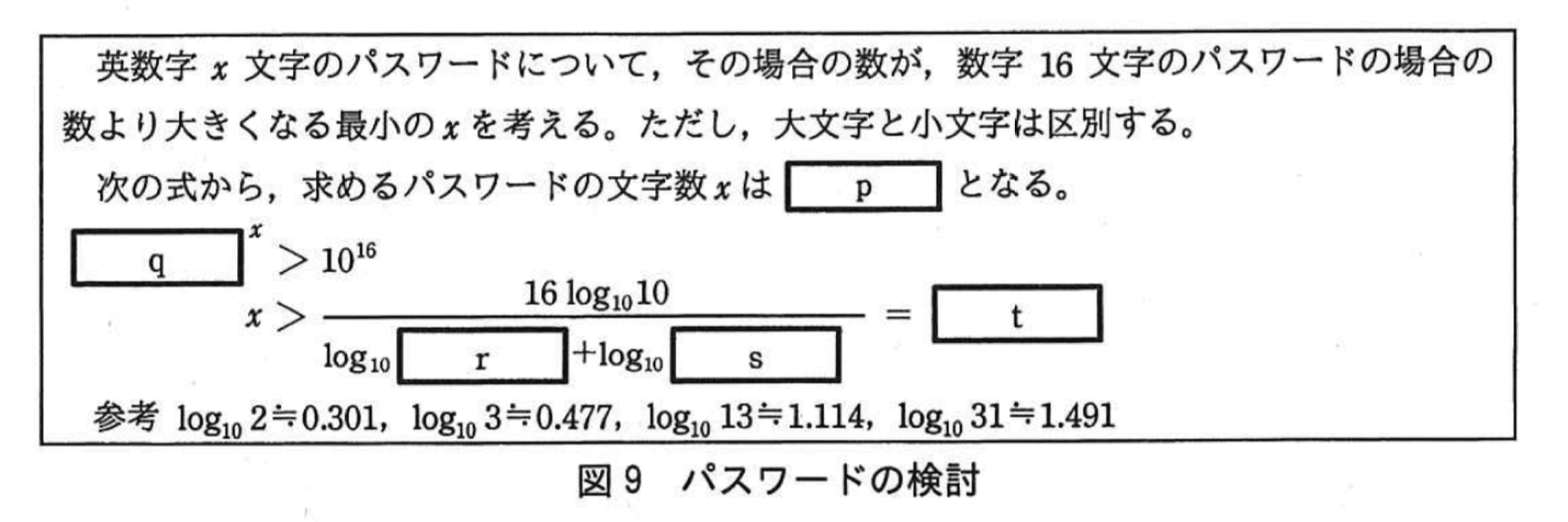 Uさんが図7のパスワードについてR主任に相談したところ、R主任は問題を指摘した。R主任は、図9を示し、数字16文字のパスワードの場合の数は、英数字〔 p ]文字のパスワードの場合の数より小さいことを説明した。また、この場合の数は、最近のコンピュータの能力向上を考慮すると、いつまでも安全とはいえないと指摘した。Uさんは、R主任の指摘を受けて、パスワードの構成を見直した。