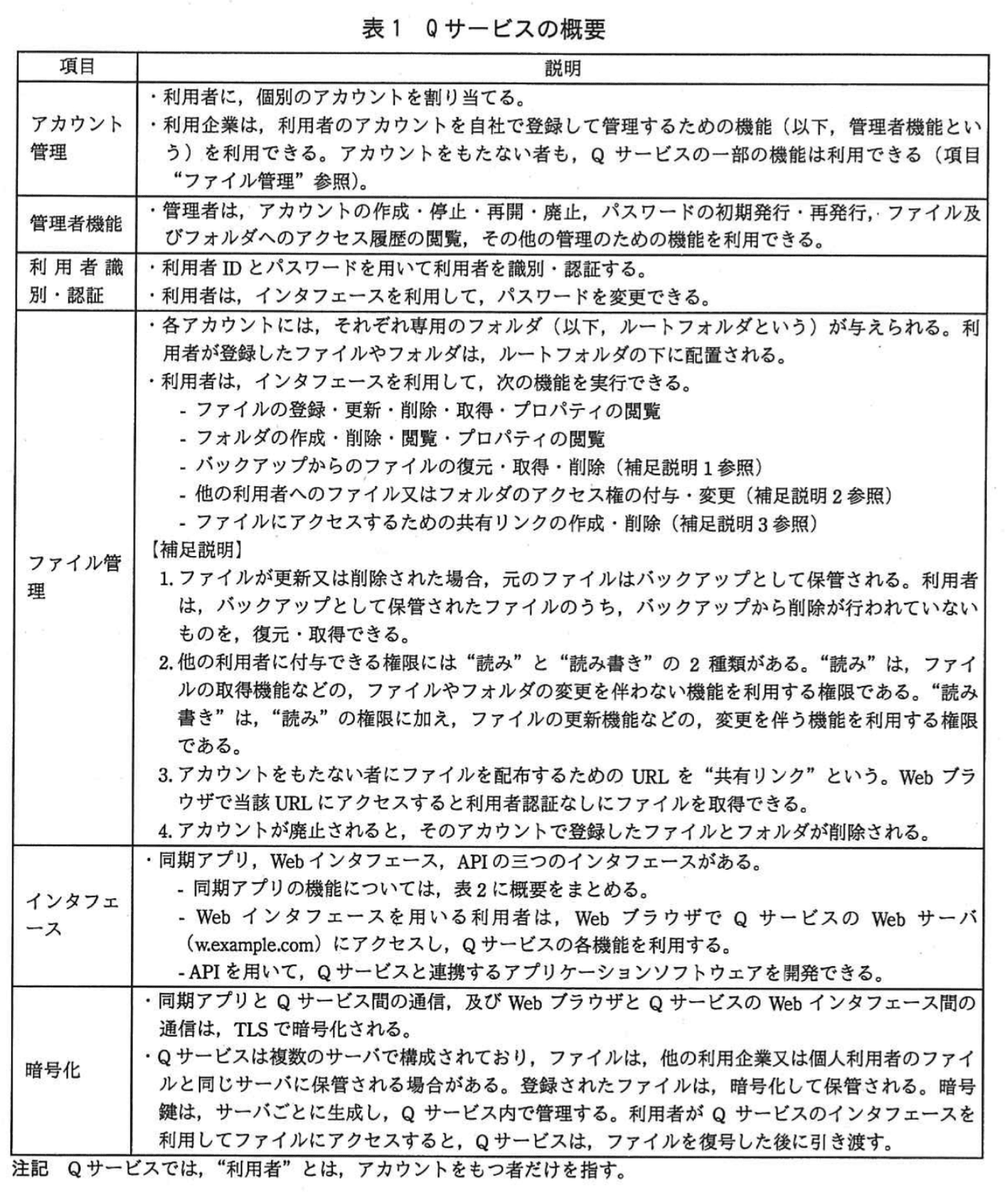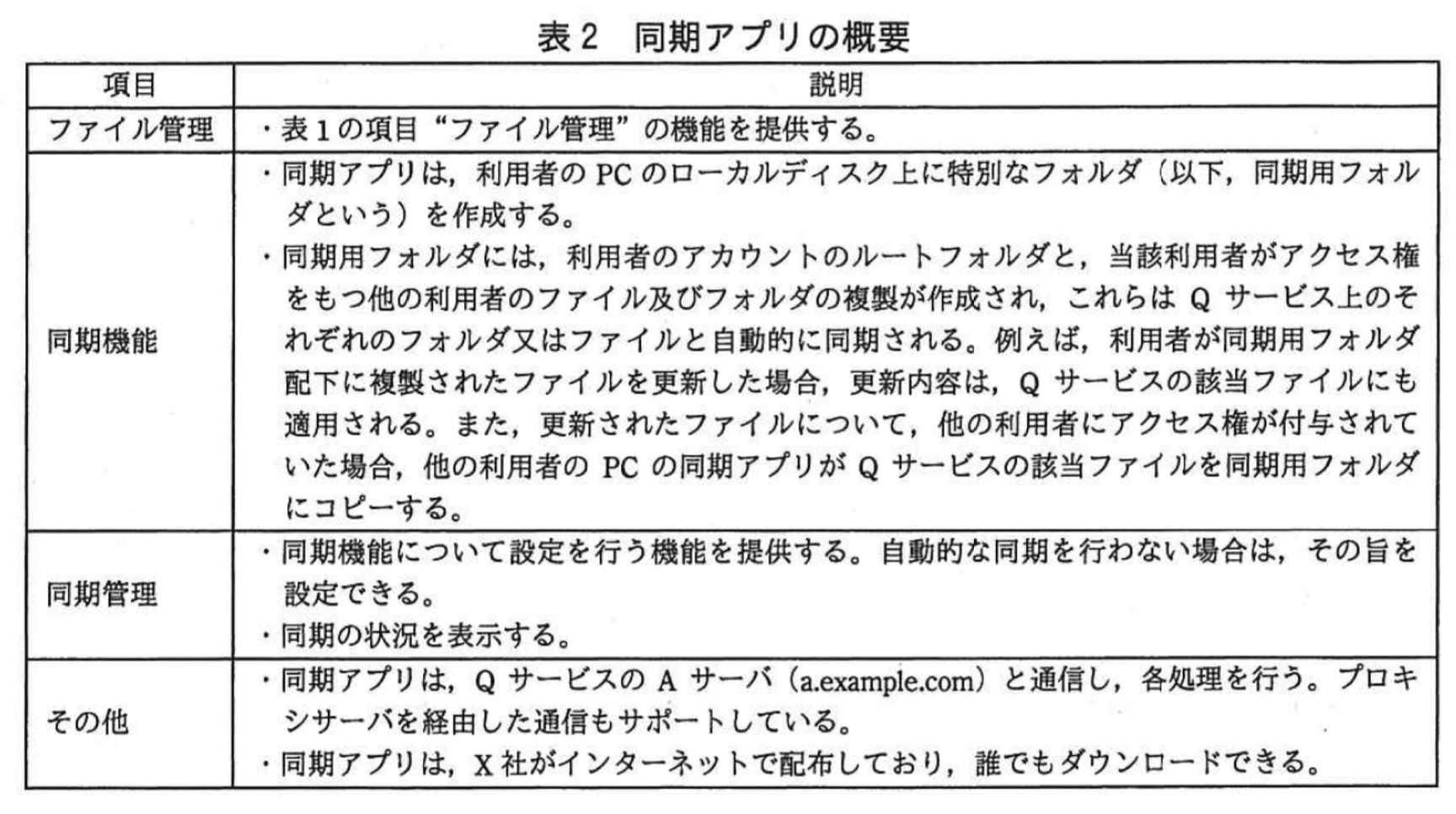 Qサービスの利用者は、インターネット経由で、Qサービスに任意のファイルを保管できる。Qサービスの概要を表1に、Qサービスの利用者用の専用アプリケーションソフトウェア(以下、同期アプリという)の概要を表2に、V社におけるQサービスの利用方法案を図1に、それぞれ示す。