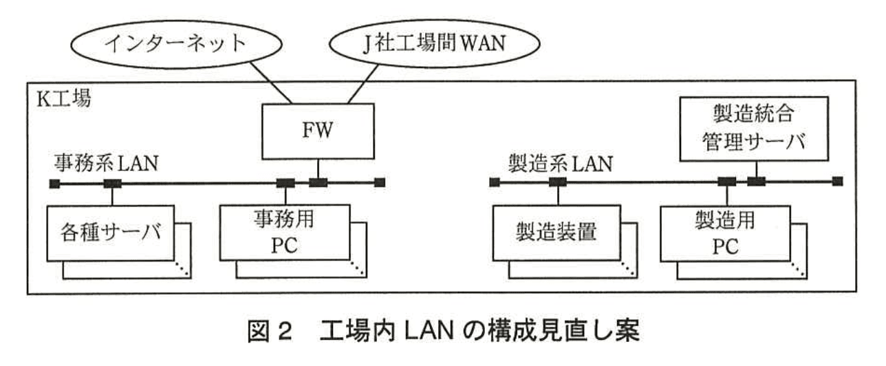 (1) 工場内LANを事務系LANと製造系LANに分離する構成見直し案(図2)を作成し、さらに、二つのLANの間のファイル転送方式案(表3)を作成した。