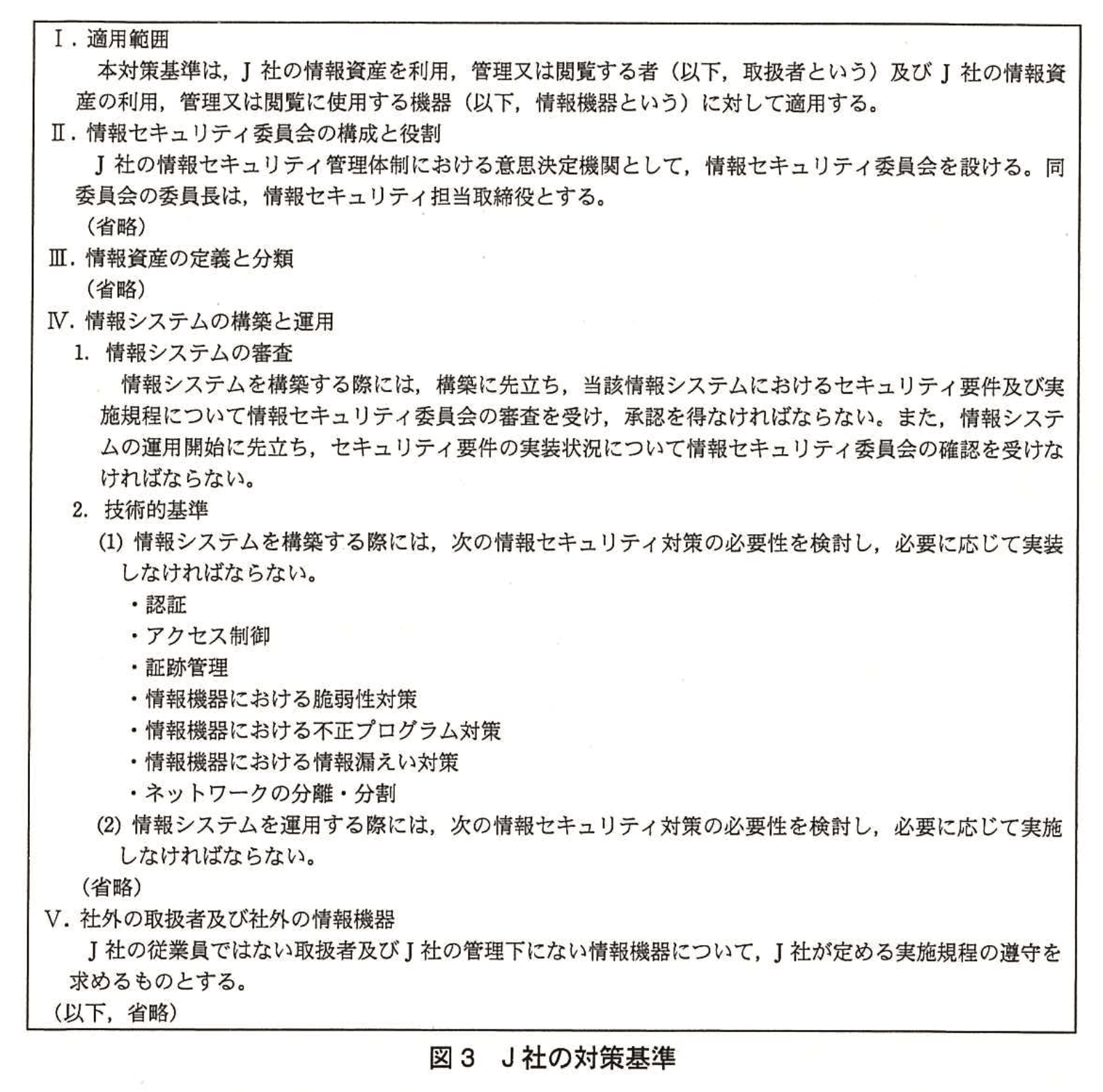 Pさんは、Kサーバの設計・構築に先立ち、J社のセキュリティポリシを確認した。J社のセキュリティポリシは、上位から順に、基本方針、対策基準及び実施規程の3階層の文書で構成されている。そのうち、対策基準を図3に示す。