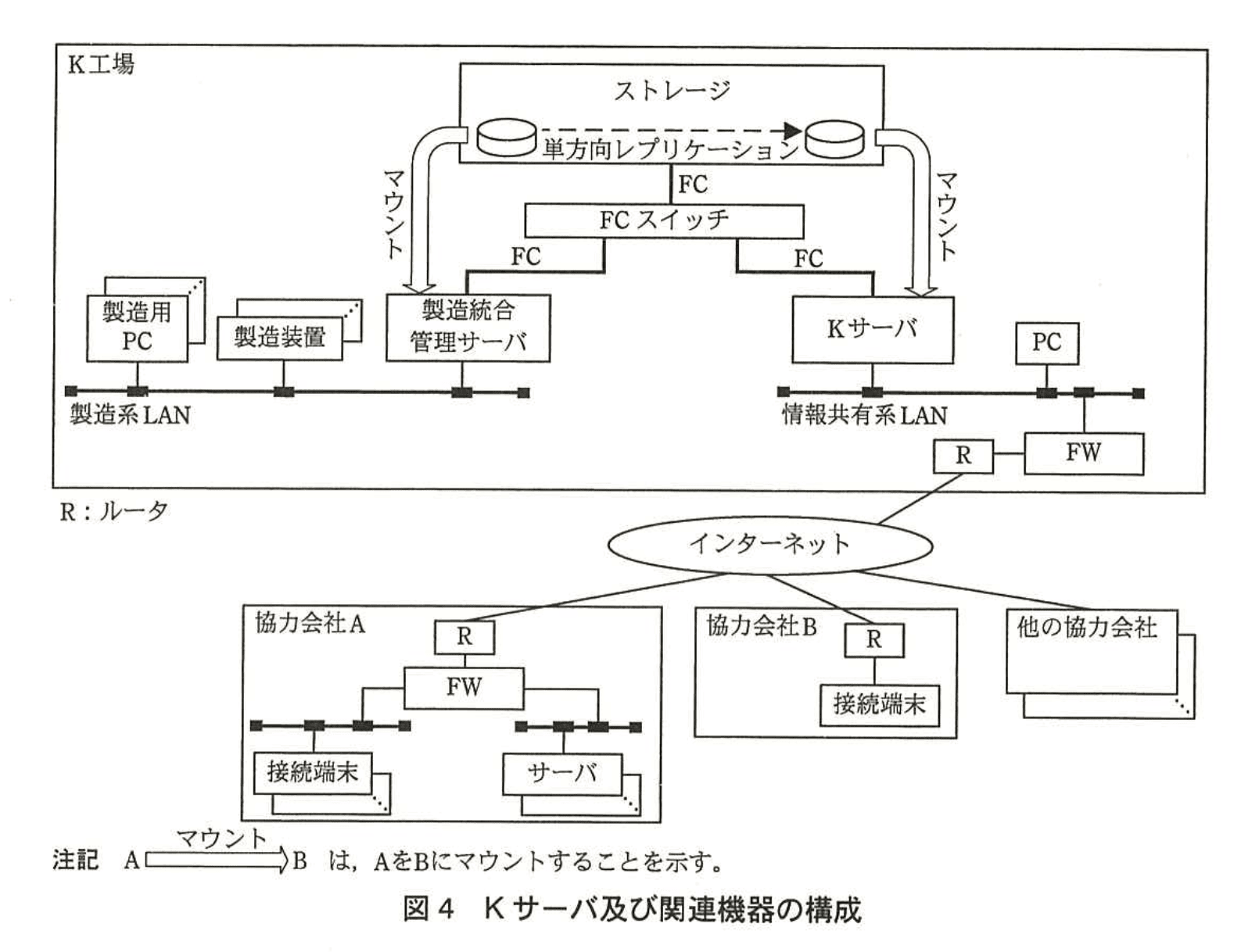 そこでPさんは、製造統合管理サーバがFC(Fibre Channel)経由で使用しているSAN(Storage Area Network)ストレージの機能である、ボリューム間の単方向レプリケーション機能に着目した。この機能を利用すると、ストレージ内のあるボリュームを他のボリュームに単方向コピーすることができる。Pさんは、図4の構成を考え、KサーバがFCを経由して利用できる機能は、単方向レプリケーションによってコピーされたボリュームをマウントする機能だけとした。